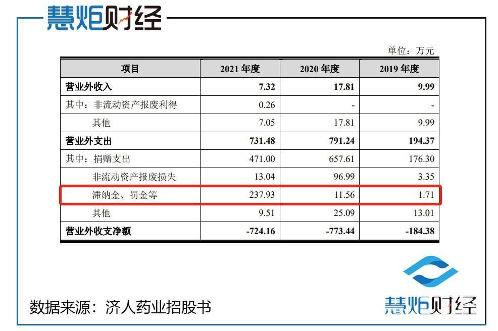 此外,报告期内,济人药业营业外收支净额合计分别为-184.38 万元、-773.44 万元和-724.16 万元。其中,2019-2021年滞纳金罚等分别为1.71 万、11.56 万及237.93万,值得注意的是,2021年滞纳金罚等高达237.93万,对此,济人药业解释为主要系配合税务部门对纳税情况进行清查及补缴而产生的滞纳金。