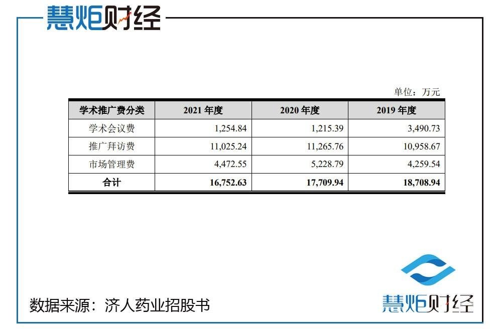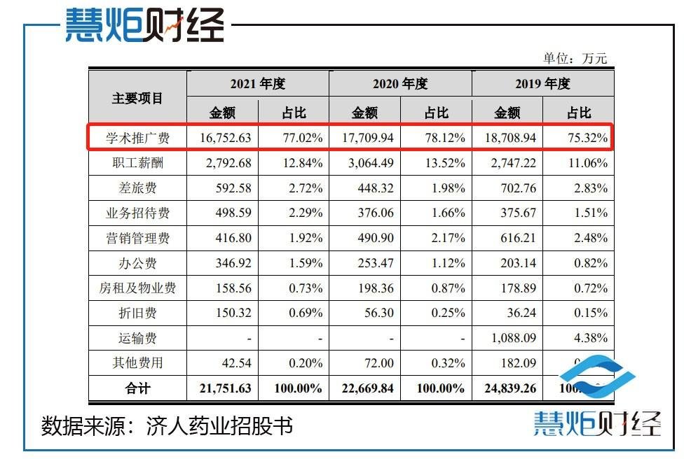 招股书显示,2019-2021年,济人药业每年销售费用分别为2.48亿元、2.27亿元、2.18亿元。而销售费用的组成又以学术推广费用为主要构成,分别为1.87亿元、1.77亿元、1.68亿元。