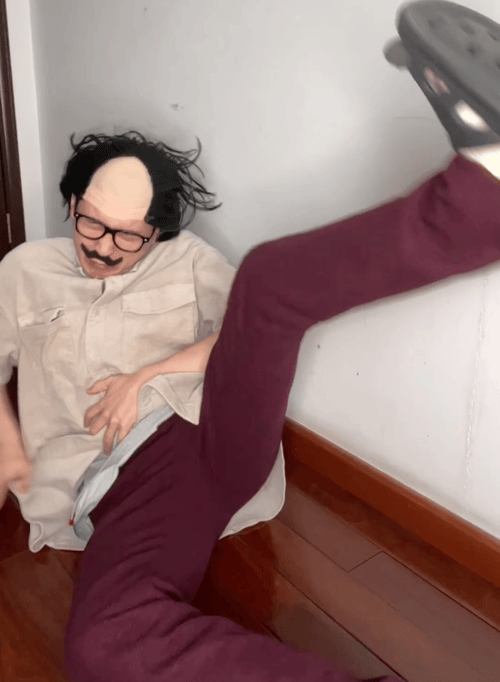 就好比下面这位带着秃头假发的老兄,胡子眼镜一样不少,单脚朝天,摔倒在地。
