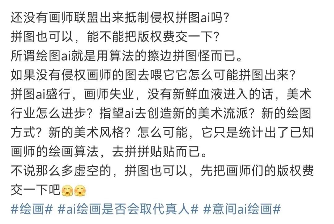 画师方的观点是,AI绘画是将多个画师的作品拼图生成的,有侵权之嫌。