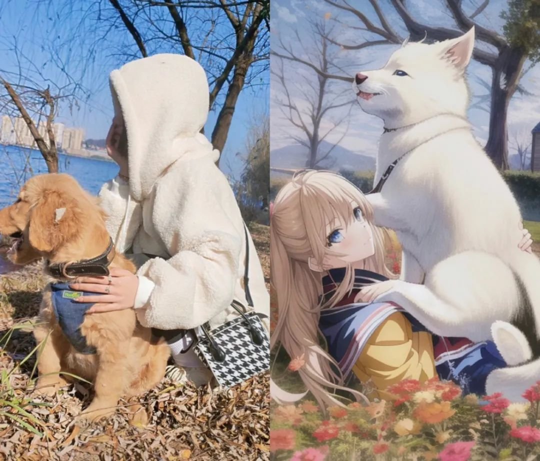 光看左边,是温馨的主人抱着自家狗子看风景,很温馨很美好。