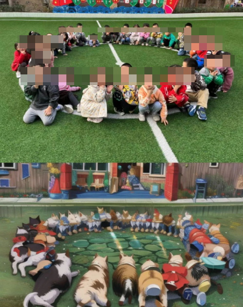 好好的一张幼儿园大合照,被AI一转换,成猫咪动物园了。