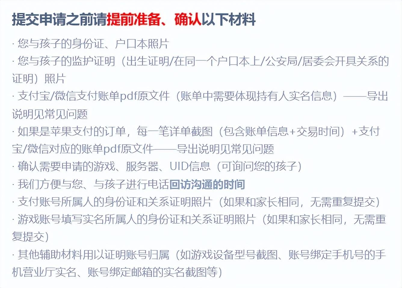 第三步,根据“在线申诉操作指引”,提前准备并确认身份证、监护证明、充值订单证明等相关材料;