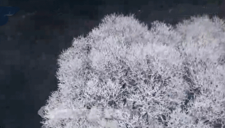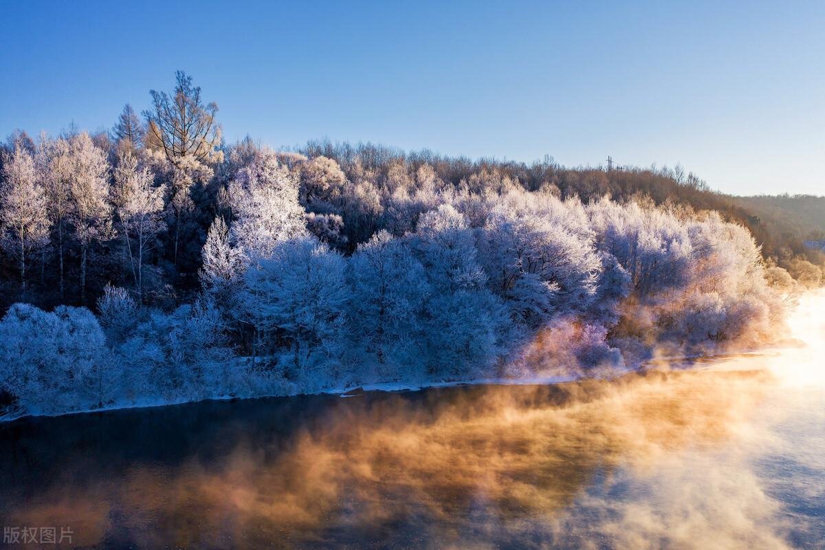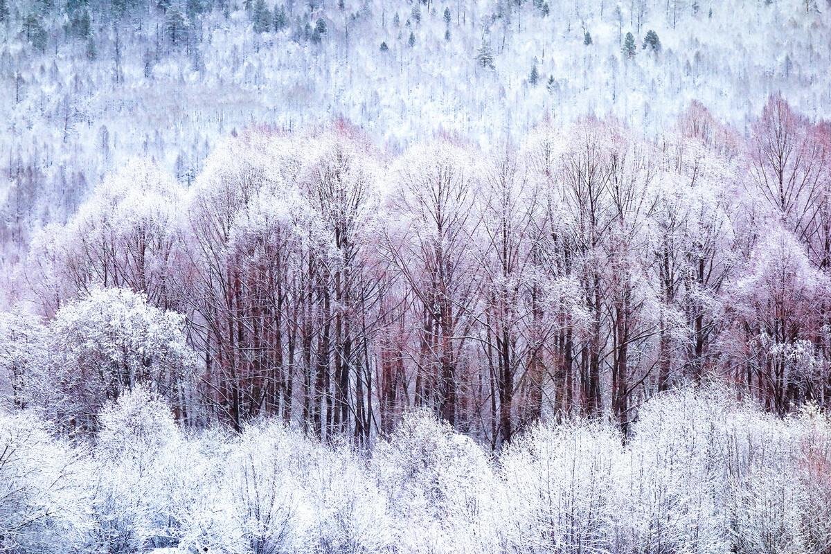 冰点之下,万物都低于冻结温度。而当低于零度的水汽遇到同样低于冻结温度的树枝,一吻即结晶,远看像细小洁白的花朵坠于枝头,这就是雾凇。