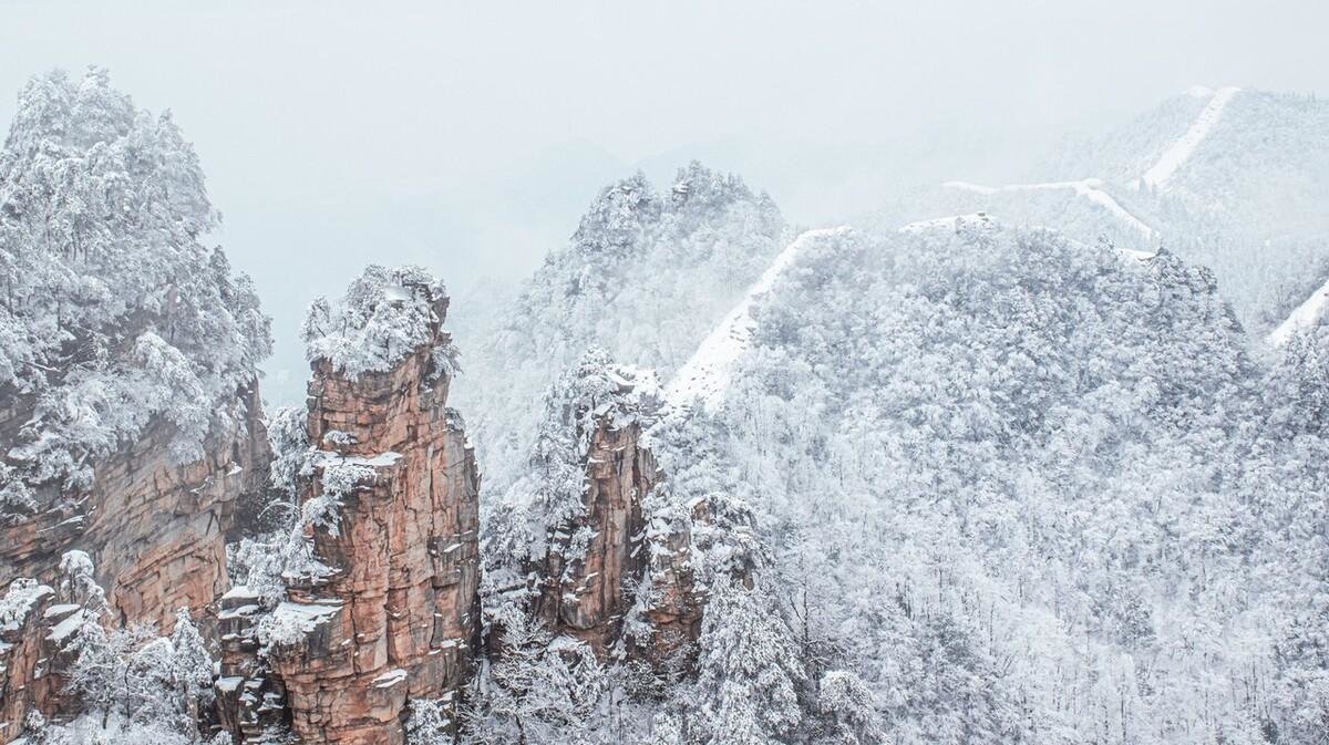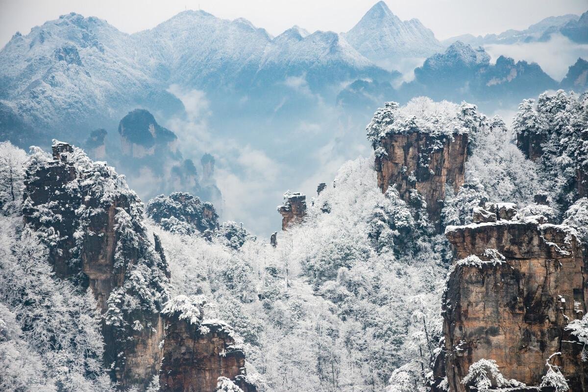 在灵秀雾凇的包围下,张家界层峦叠嶂的石峰林,拔地而起的石柱,犹如舞人齐插玉珑璁。