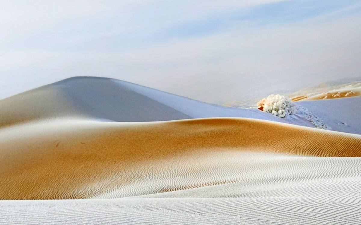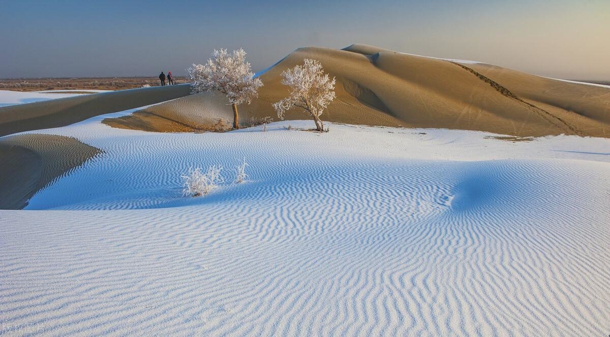 在新疆古尔班通沙漠,一望无际的沙海中,银丝垂绦的雾凇为沙漠增添了“瀚海阑干百丈冰”的雄浑壮丽。