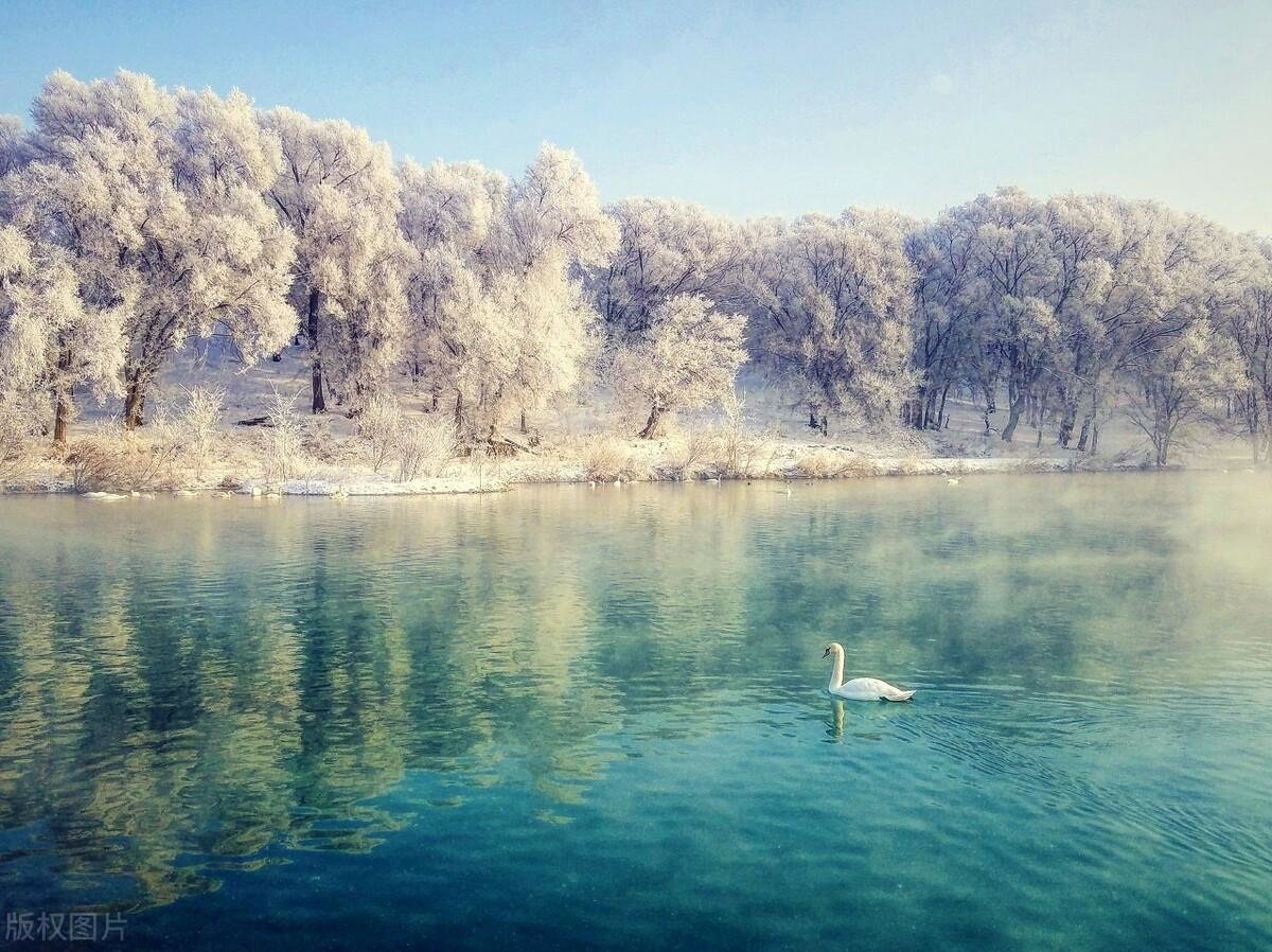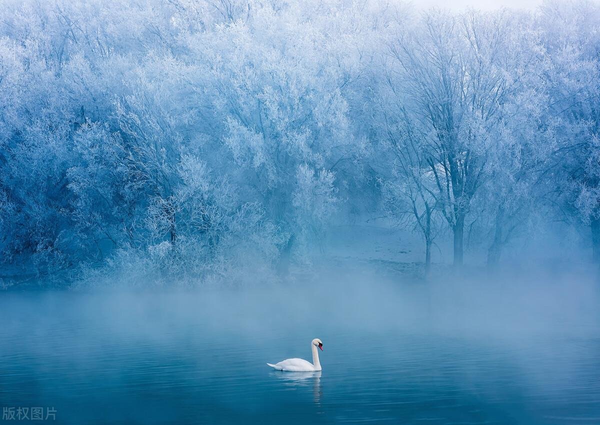 有朦胧的雾气做底,有蒸腾的湖水做媒,再有洁白的天鹅做衬,伊犁的天鹅泉为我们带来了静谧优雅的雾凇之景。