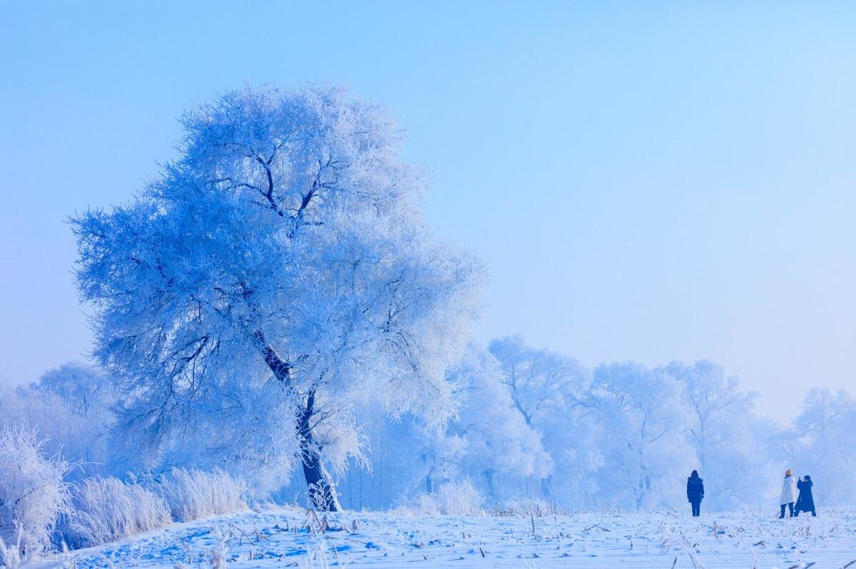 在深冬的清晨,雾凇如花绽放,一树树、一片片,衬着琉璃蓝的天色,旁若无人的美着。