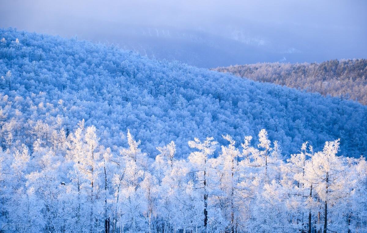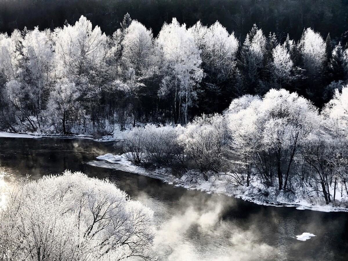 茫茫林海一夜上了雪妆,绵延上百里的壮丽雾凇,婆娑雪白,如夏日般繁茂悠然。这冰晶是如此脆弱,可这山林却又仿佛能盛得下这世间所有的野性。