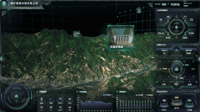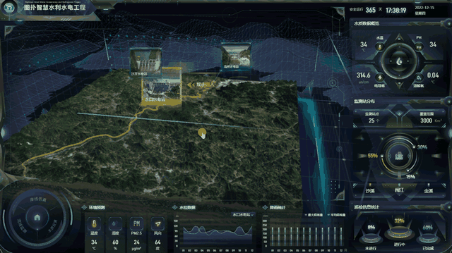 将可视化与 GIS、粒子仿真、虚拟现实、边缘计算等技术相结合,数字孪生闽江流域水利工程,实现坝、堤、溢洪道、水闸、渠道、渡漕、筏道、鱼道、水电站、水质、环境、水位、降雨等的实时监测,实现对水力资源的可持续利用。
