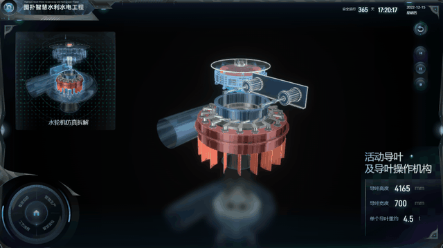 开机后,调速系统操作导水机构开启活动导叶,蜗壳内的高压水流经其内侧均匀排列的固定和活动导叶形成一定环面后,均匀可控地进入水轮机转轮,连续的带压水流从转轮叶片外缘整周径向流入,从转轮出口轴向流出,水力反作用于转轮叶片,使转轮产生旋转力矩并带动转轮旋转,水力势能转变为机械能。在图扑可视化系统内接入了单个机组的转速、导叶开度等数据。