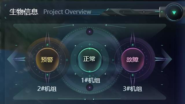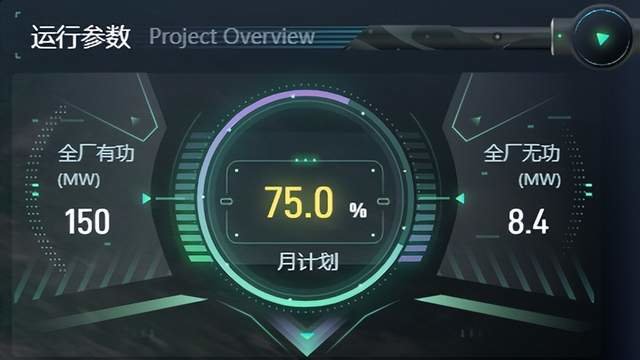 图扑软件采用不同类型的图表形式统计了全厂有功功率、无功功率、日发电计划完成率、月发电计划完成率、日累计发电量、月累计发电量、年累计发电量等数据。利用黄色、绿色、紫色区分预警、正常、故障三种机组状态,及时识别机组是否良好运行。使用全厂有功、全厂无功双曲线的形式,展示了近 12 小时内单个机组的功率波动情况,让电厂实现精细化管理。