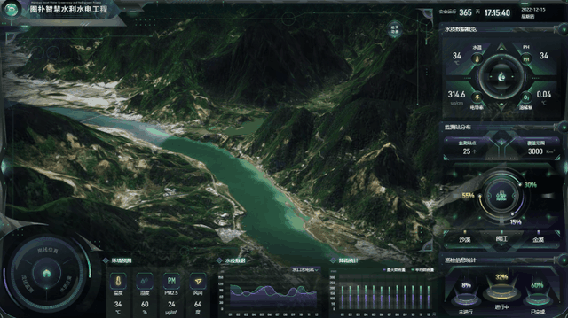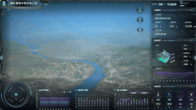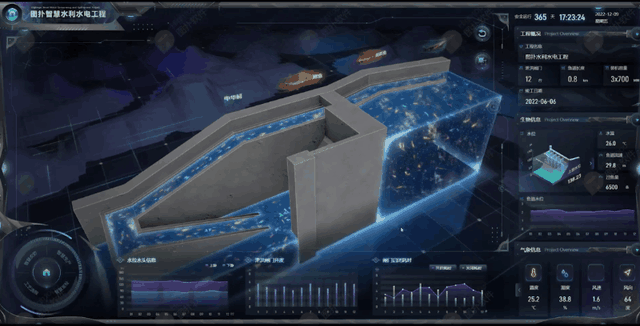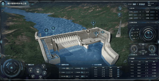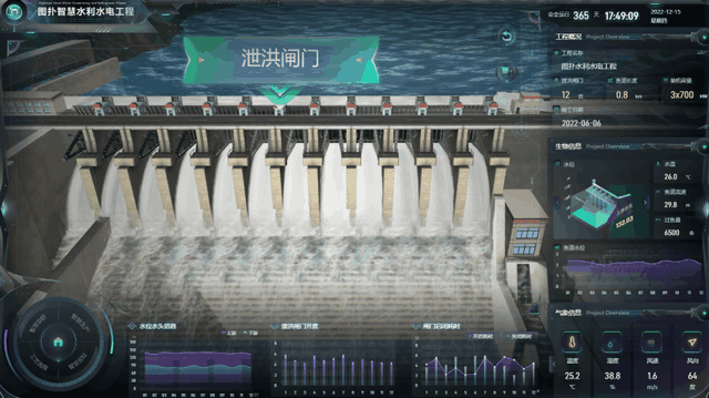 通过图扑智慧水利水电工程案例可直观地查看大坝主体数个泄洪闸门实时的启闭状态,辅以气象信息、水位信息数据显示,帮助集控中心的人员在汛期及时作出决策。