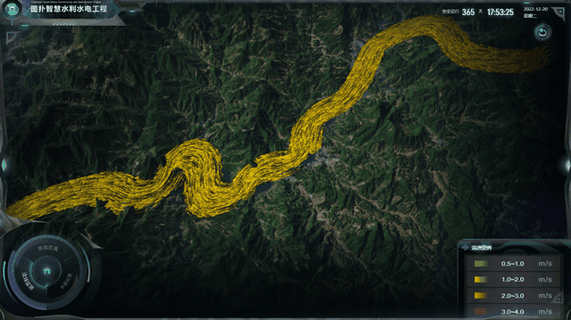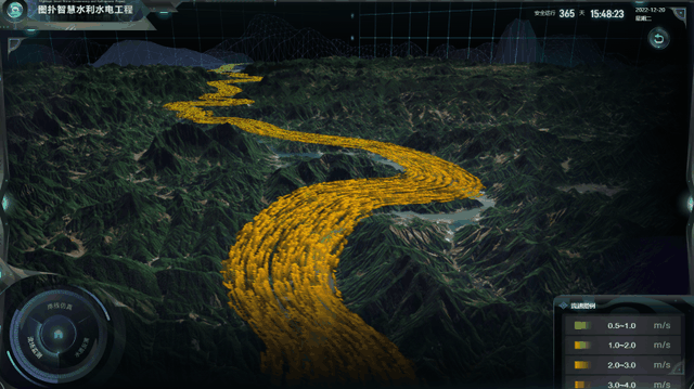 运用图扑研发的力场粒子效果,仿真模拟出江流流动,结合不同流速区间对应的不同粒子颜色,对流场进行渲染,实时展示流速数据。
