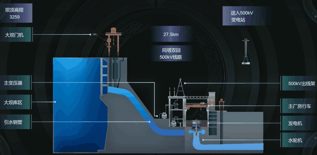 通过接线端子引出,将导线连成闭合回路,回路中产生电流与电压,经过发电机出口母线,电流进入升压变压器,在这里电压被升至 500kV,然后进入六氟化硫气体绝缘开关站(GIS),连接输电线路进入电网,从而完成水轮发电机组的电力生产到输送的最后一个环节。