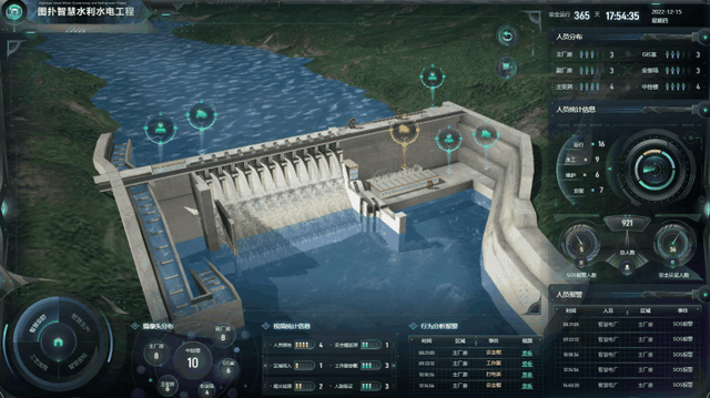 大型水电站都具有装机容量大的特点,影响着区域供电。一旦站内的水库、大坝(含副坝)、发电厂房、引水渠等发生故障,将造成大面积停电,严重影响社会的和谐稳定。图扑水电站的智慧安防系统关联站内监控信号源,显示现场监控画面,对区域闯入、烟火、故障等进行监测,保障站内设施设备的良好运行。3D 场景内图标可点击查看相应监控画面、人员名称、报警时间、报警详情。。