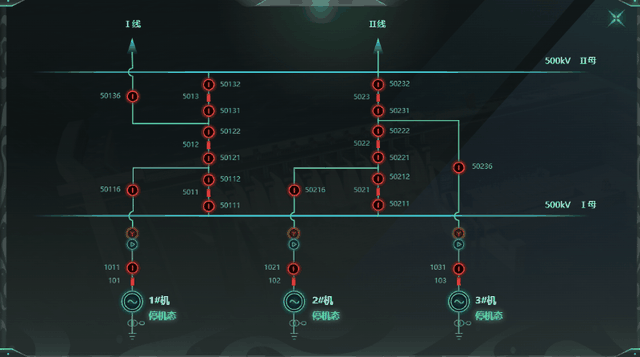 水电站发出的电力需由空架输电线路输送到用户集中区的变电所。由于机端负荷较大,出线回路数多,因而发电机电压级接线一般采用有母线的接线方式。根据容量可为单母线、单母线分段、双母线、双母线分段。当机组容量较大时,可在母线分段处和出线上加装电抗器,以限制短路电流。利用图扑软件大屏组态、UI 组态展示主接线图,实现对线路运行状况的监控。用红色字表示设备正在运转,绿色字表示已停机。对接电厂的隔离开关、断路器、发电机等设备数据实现实时状态展示。