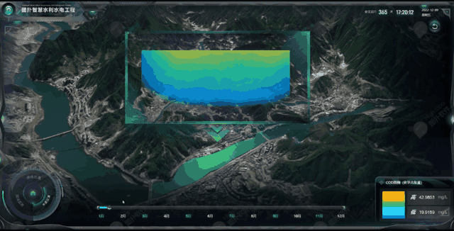 基于已采集的江流、水库水质历史数据,使用图扑软件研发的云图渲染技术,取出某段立体水域,将水质数据的高低,用立体云图展示,并支持操作时间轴,反演全年的水质变化情况。根据推演数据判断水中化学残留物的含量、水中盐分、下游河水含盐量、水中血吸虫数量、微生物及细菌的数量、水生植物及藻类数量等。当出现严重水质问题时,及时采取补救措施。