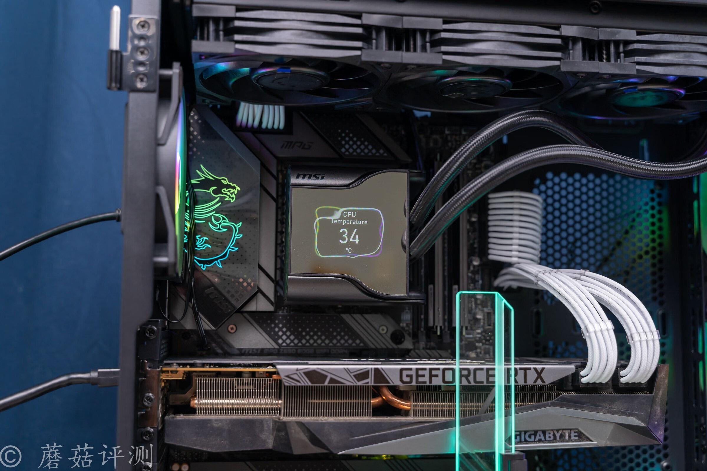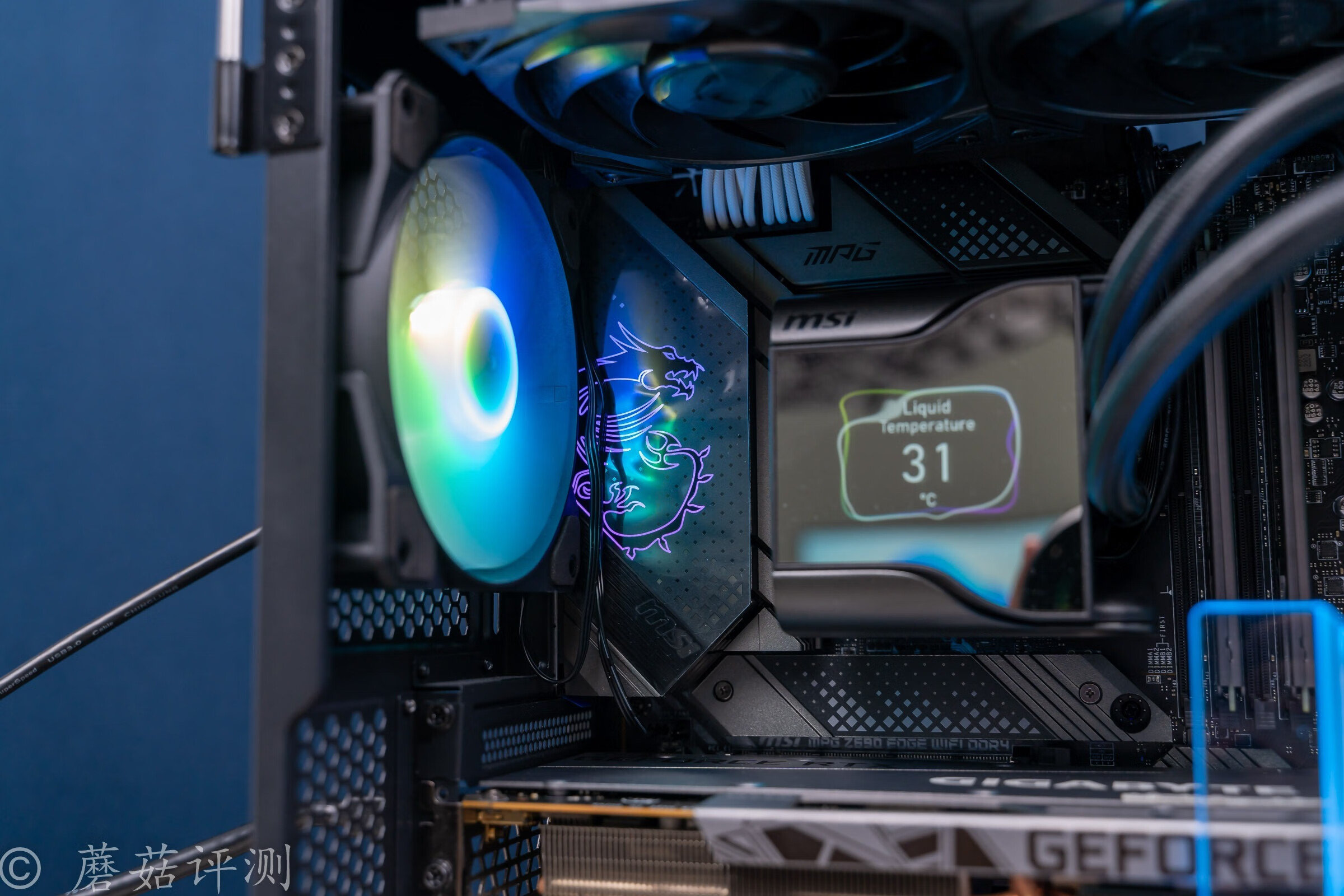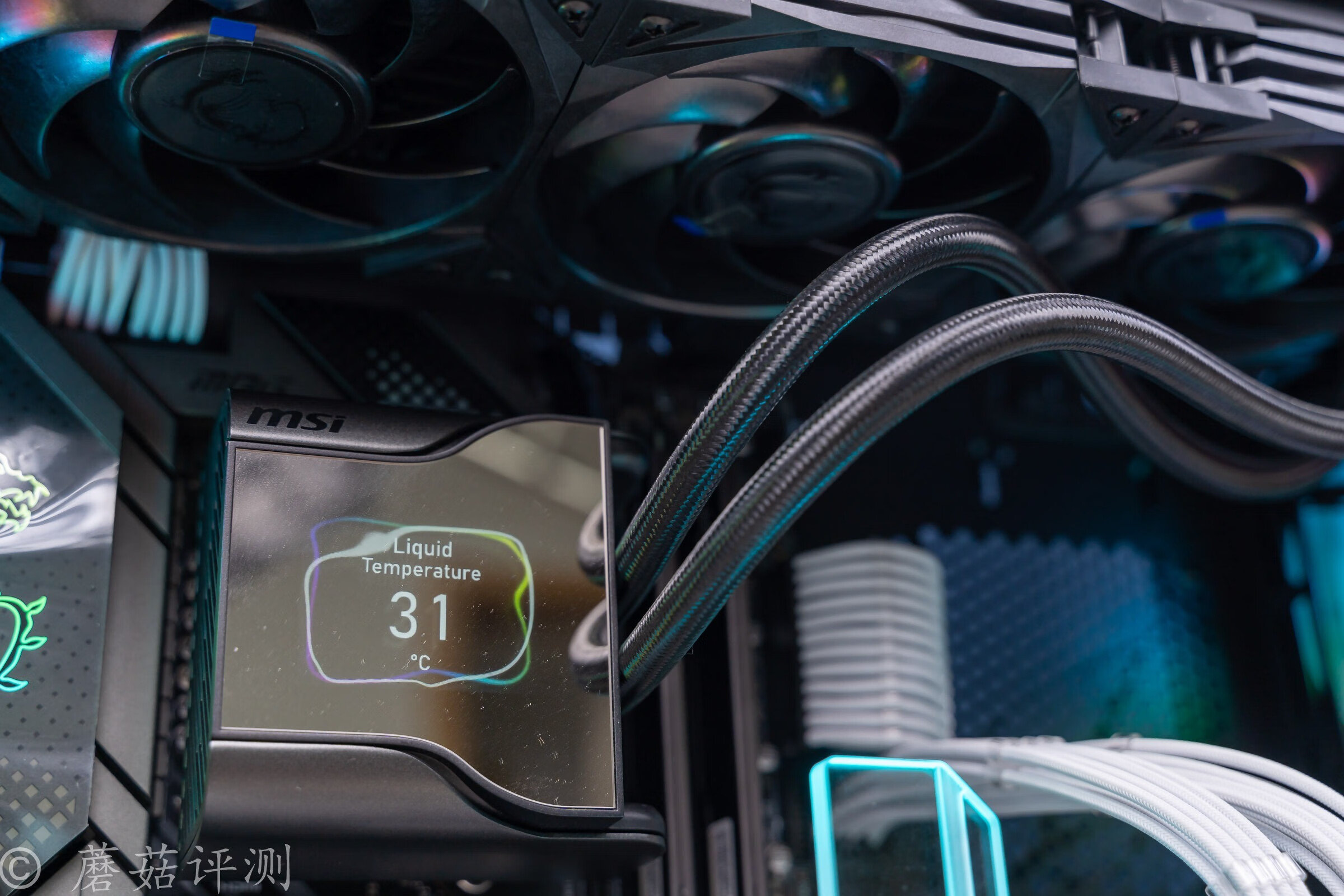 ▼散热用的是微星的战神S360水冷,水冷的水冷头顶部有屏幕,可以显示图片、文字、动图和硬件参数,玩法很多样。