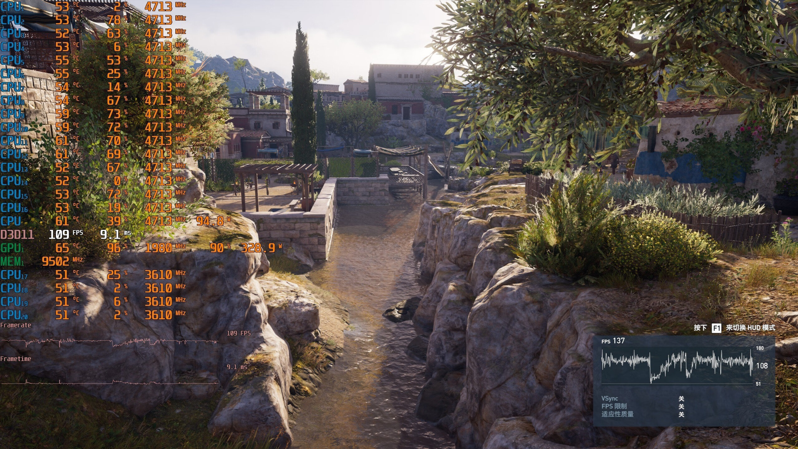 ▼室外的游戏帧数,在109帧左右,也是非常流畅的。