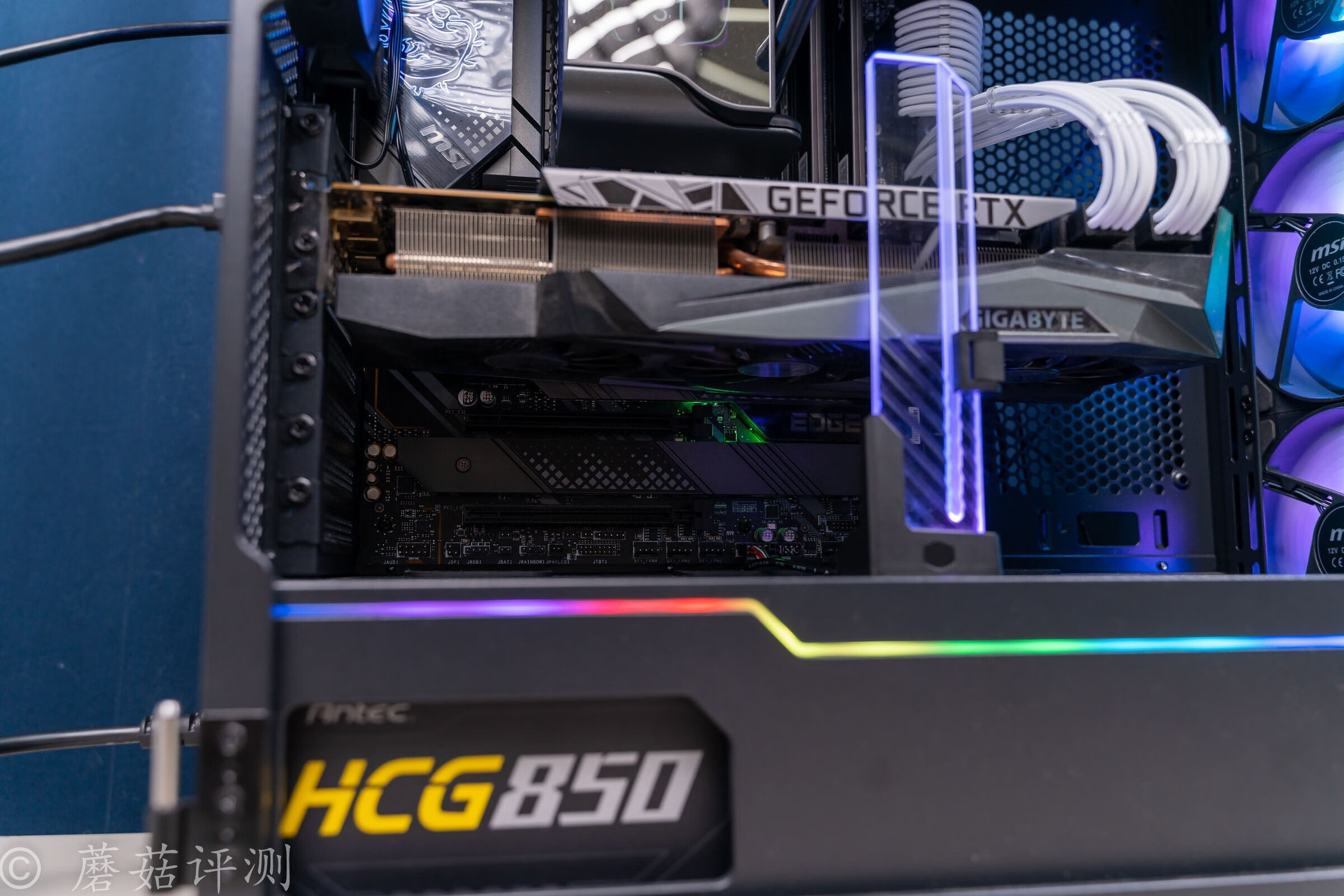 ▼电源仓的侧面还有开口,可以将电源的侧面展示出来,一眼就能看到内部的安钛克的HCG850金牌全模组电源。