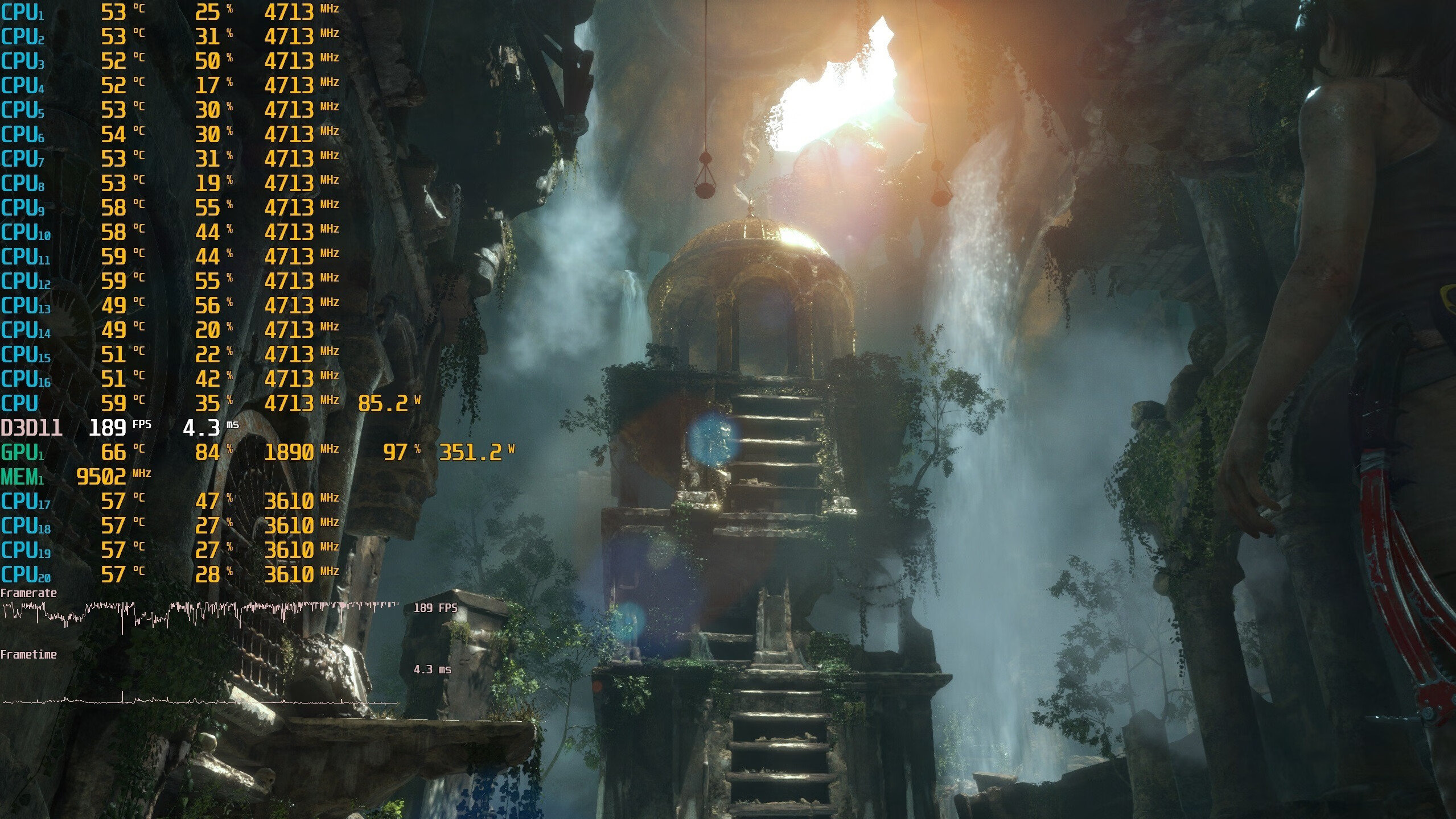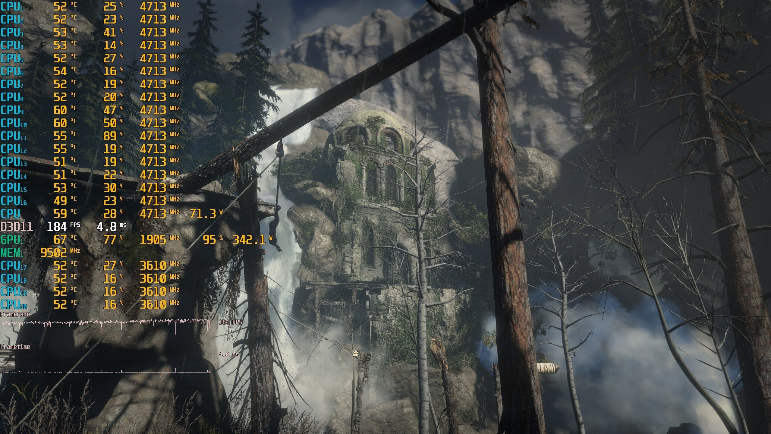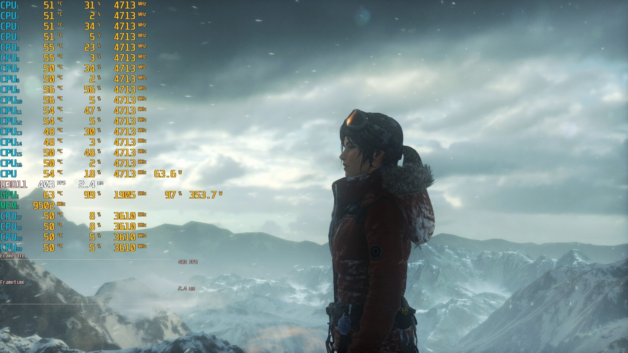 ▼古墓丽影,2K分辨率,全高画质,第一个测试场景,游戏帧数在403帧左右,非常流畅。