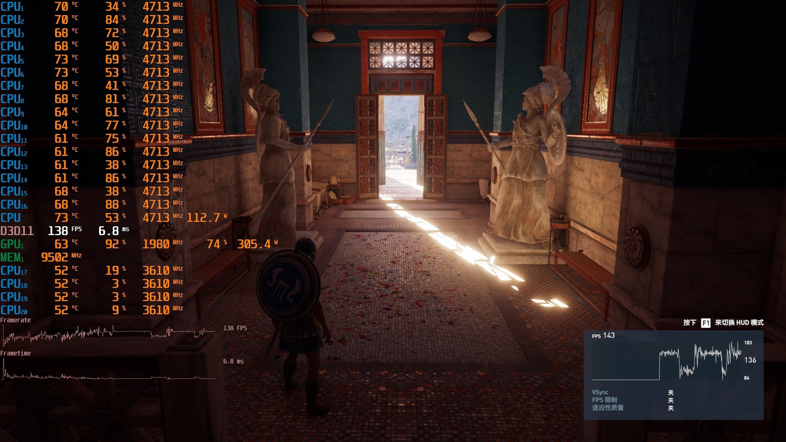 ▼众生平等奥德赛,2K分辨率,全极高画质,体积云最低,走廊游戏帧数在138帧左右。
