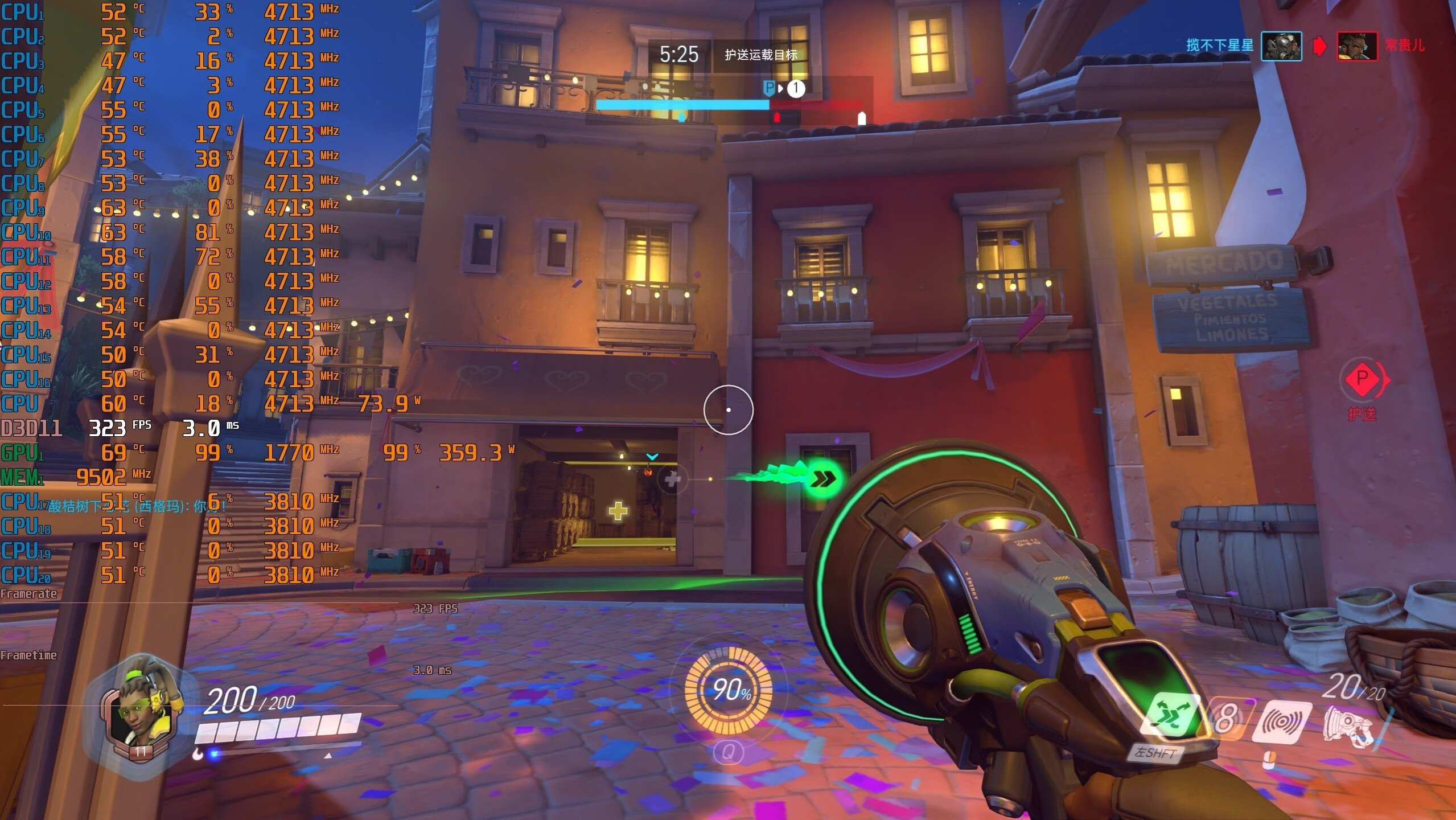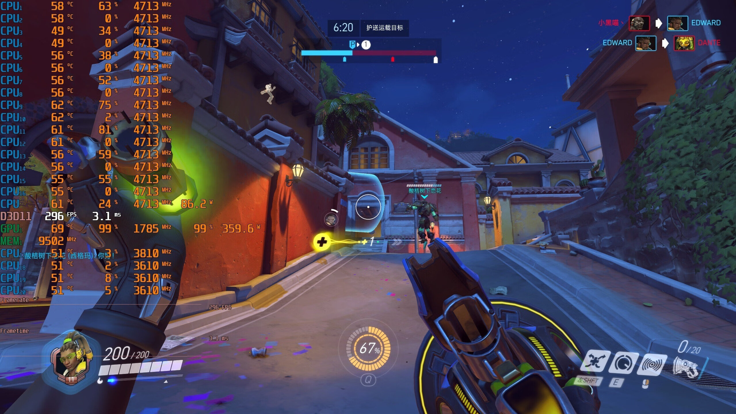 ▼守望先锋,2K分辨率,全极高画质,团战的游戏帧数在296帧左右,非常流畅。
