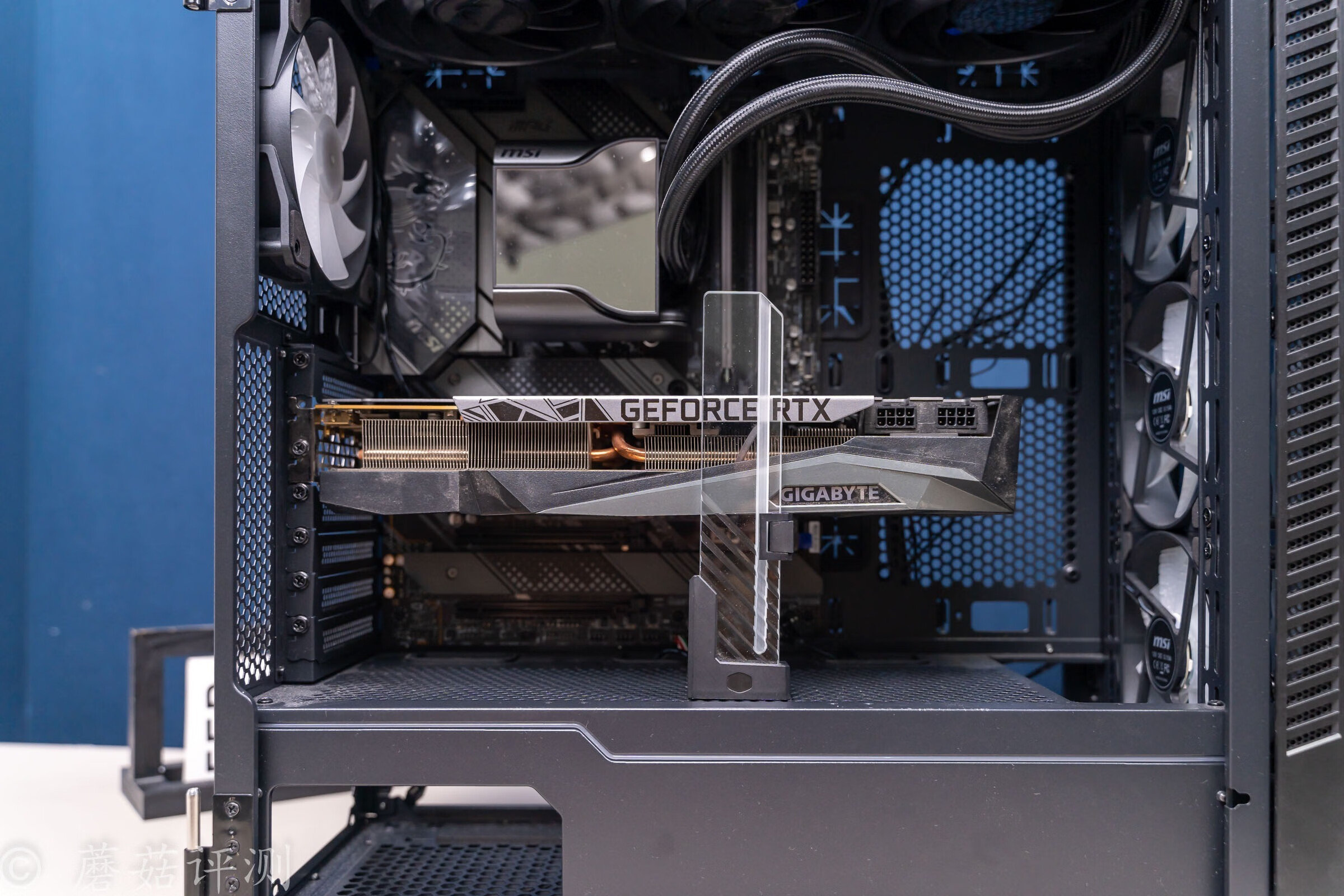 ▼显卡默认横置安装,在显卡的中部位置撑一个显卡支架。