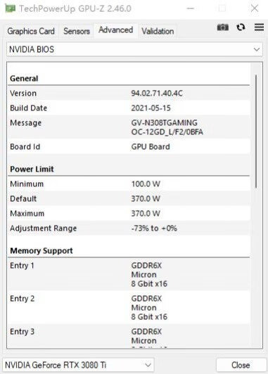 ▼简单看下显卡的BIOS,额定功耗370W,还是很给力的。