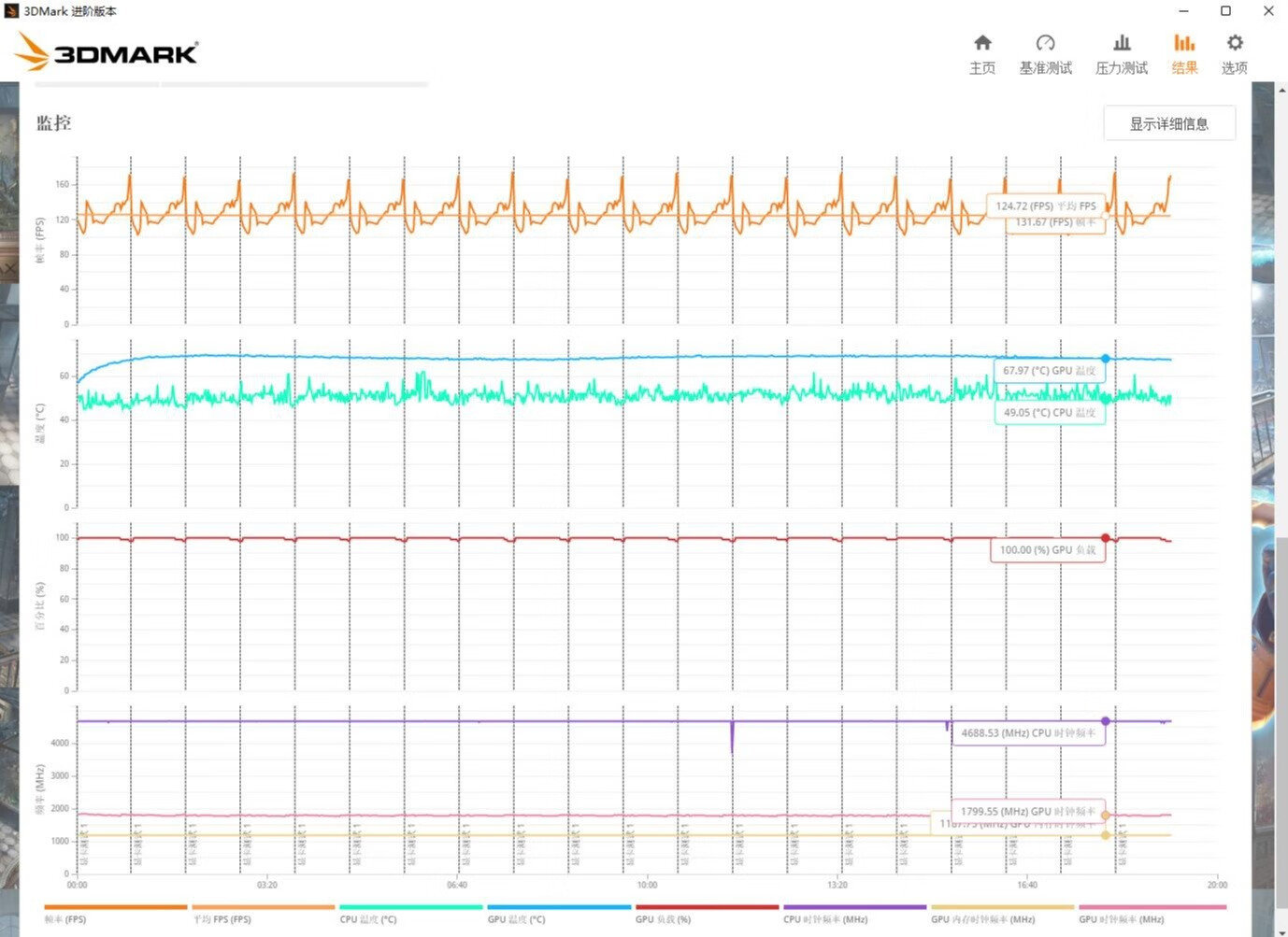 ▼3Dmark的压力测试,TS模式,帧数稳定率在99%,非常稳定。