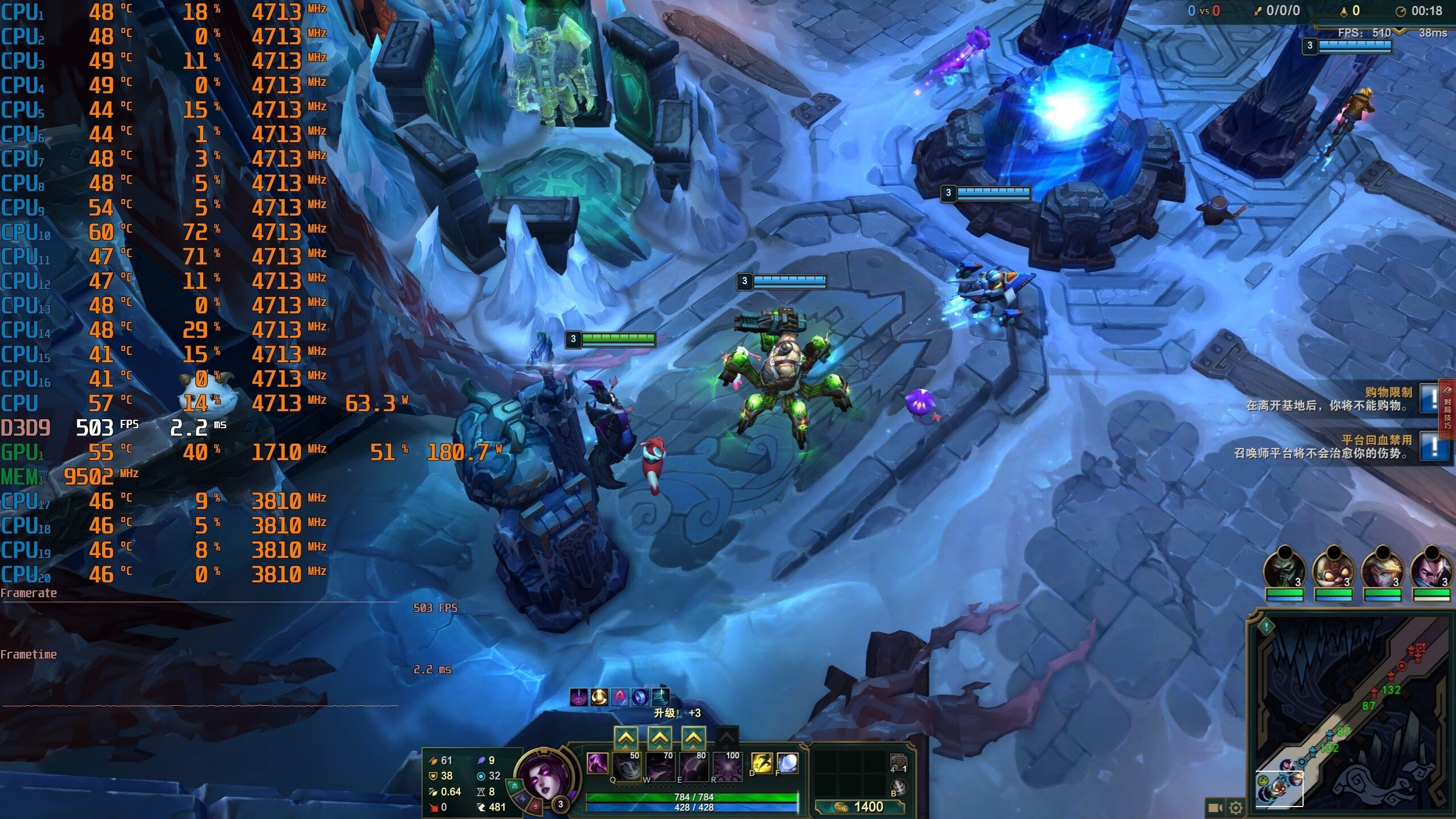 ▼游戏实测,LOL大乱斗模式,2K分辨率,全极高画质,泉水游戏帧数在503帧左右。