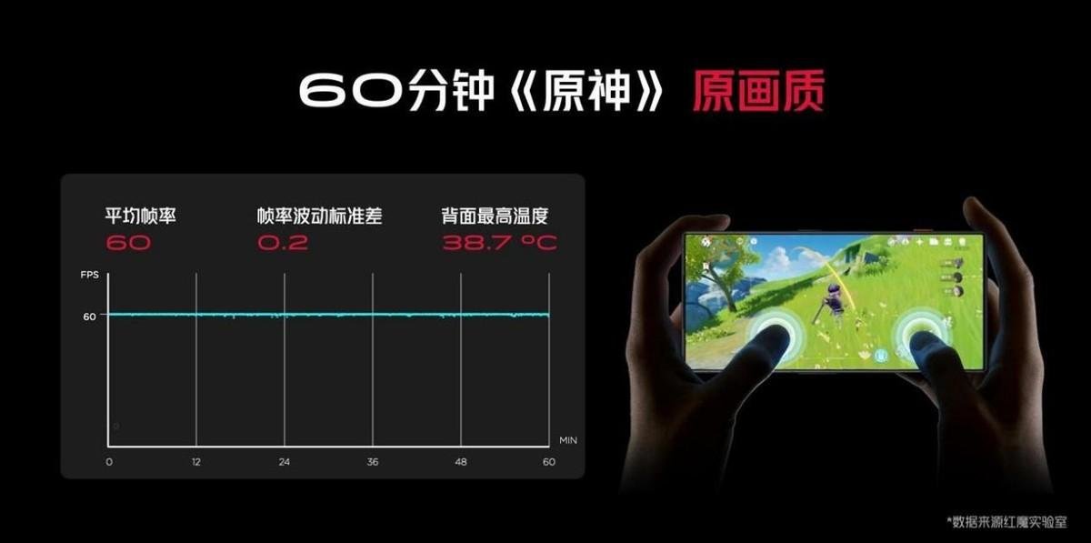 为了让红魔8 Pro系列在如此狂暴的性能输出下还能保持合适的手感温度,其散热系统进化到ICE11.0魔冷散热。首创3D冰阶双泵VC,体积达到行业顶尖的2068mm³;还拥有面积最大的全贯穿式风道,内置鲨鱼鳍离心风扇,空气流量提升35%;行业首创面屏下石墨烯,屏幕均热能力提升6倍。一共10层散热结构让机身温度下降16℃以上。实测原神运行60分钟,机身最高温度仅38.7°!