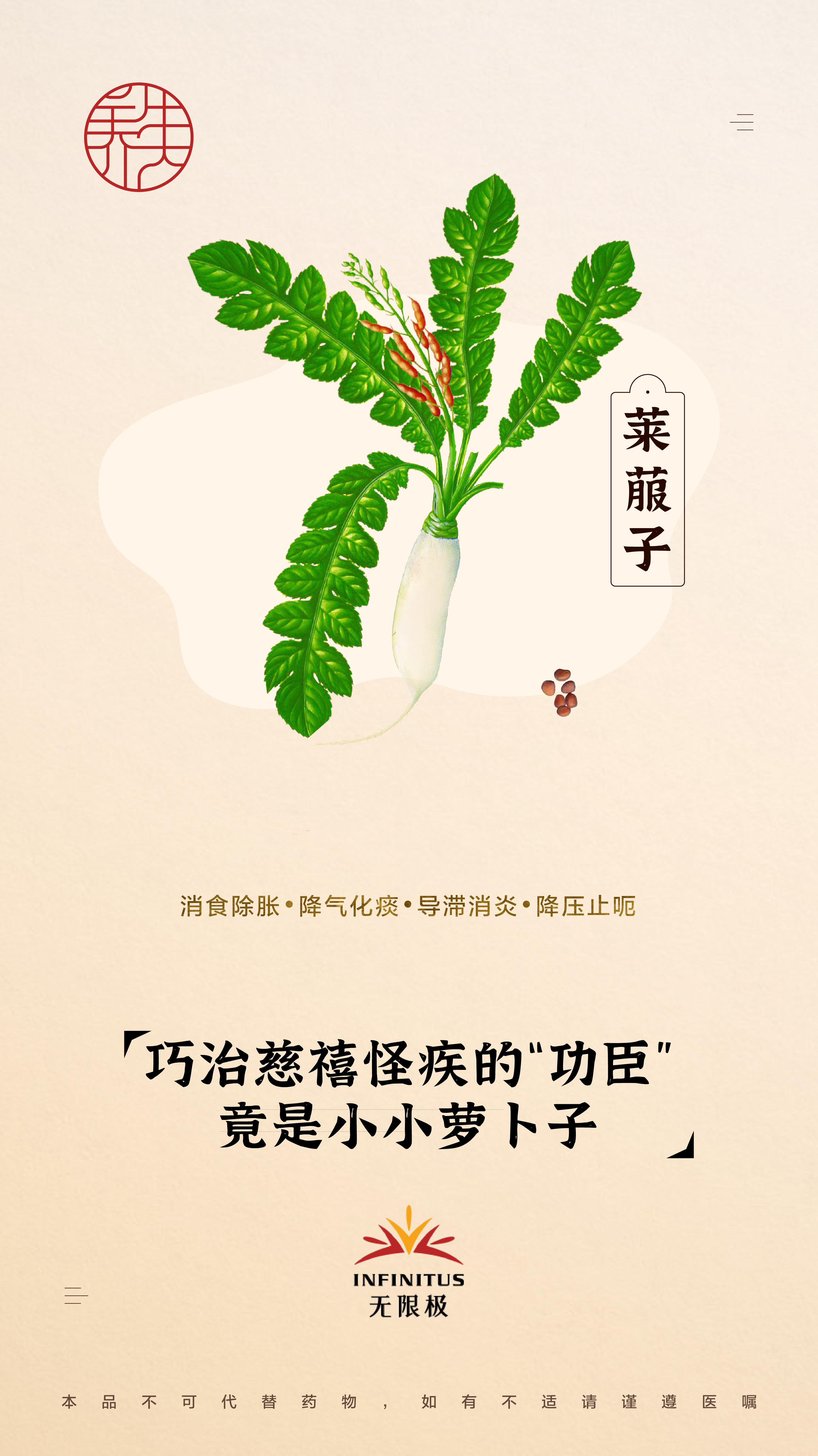 其实莱菔子就是萝卜干燥成熟的种子,也有人将其称之为:萝卜子、萝白子、菜头子。相传当年慈禧太后生病,太医给慈禧吃了大量补药,结果病情却越来越严重,不光眩晕眼花不思饮食,怒火一来还流鼻血。急得宫里的人赶紧发布皇榜招募治病的医生。后来有位江湖郎中揭下了皇榜,去给太后开药。在给太后诊脉后,他不慌不忙地从药袋里取出三钱莱菔子研成细末和面粉混合,制作成三个丸子,让太后一日三次,每次一颗服下。太后一丸下去鼻血就止住了,二丸下去,眩晕也除了,三丸末了,太后诸恙已平,食欲顿开。后来太后加倍赏赐了郎中。郎中高兴地出了宫门,感慨之余,遂立传作诗曰:“莱菔虽小有奇功,一朝出马显神威,代参消滞通肠胃,太后御医赞美名”。