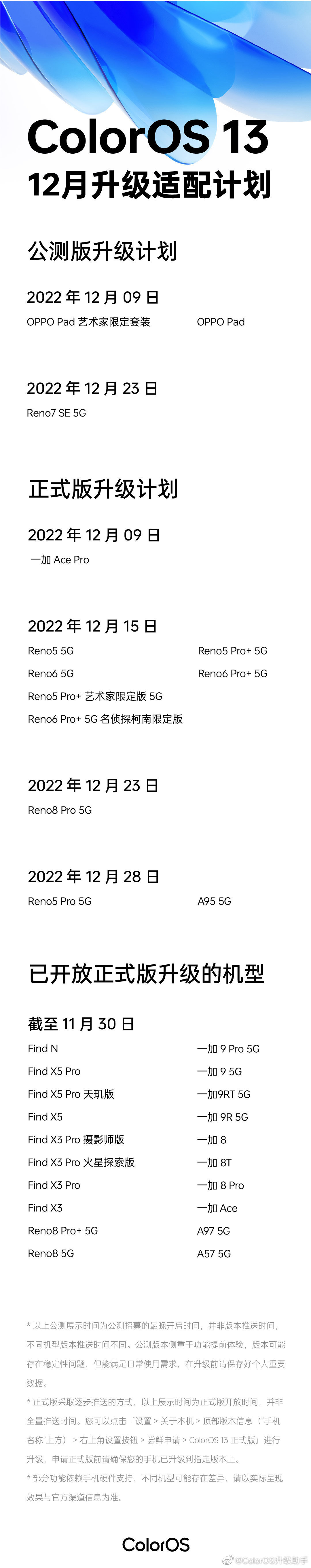 IT之家了解到,ColorOS 13 的 12 月升级适配计划包括 OPPO Pad 在内的 3 款设备将推送公测版升级,包括一加 Ace Pro、OPPO Reno5 系列的 10 款设备将推送正式版升级。