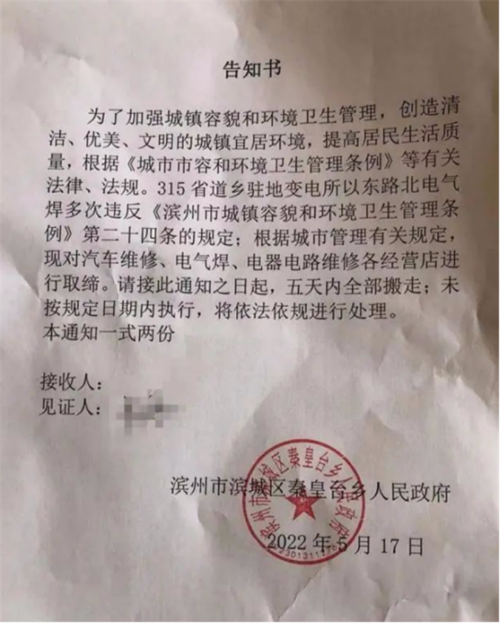 今年中旬,一封落款为山东省“滨州市滨城区秦皇台乡人民政府”的“告知书”在网络上流传,其内容大体为,为加强城镇容貌与创造城镇宜居环境的考量,现对汽车维修、电气焊等门店进行取缔。