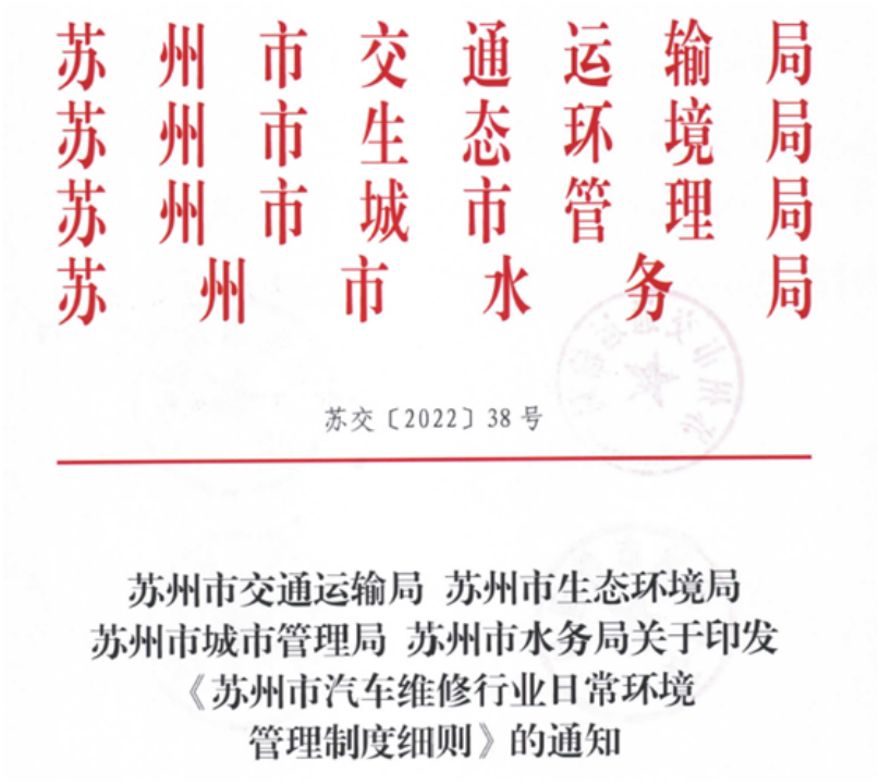 苏州多部门联合编制印发“红头文件”《苏州市汽车维修行业日常环境管理制度细则》中,对汽修店设备、排污、危废物等方方面面均设置了要求,号称“最严汽修环保政策”。