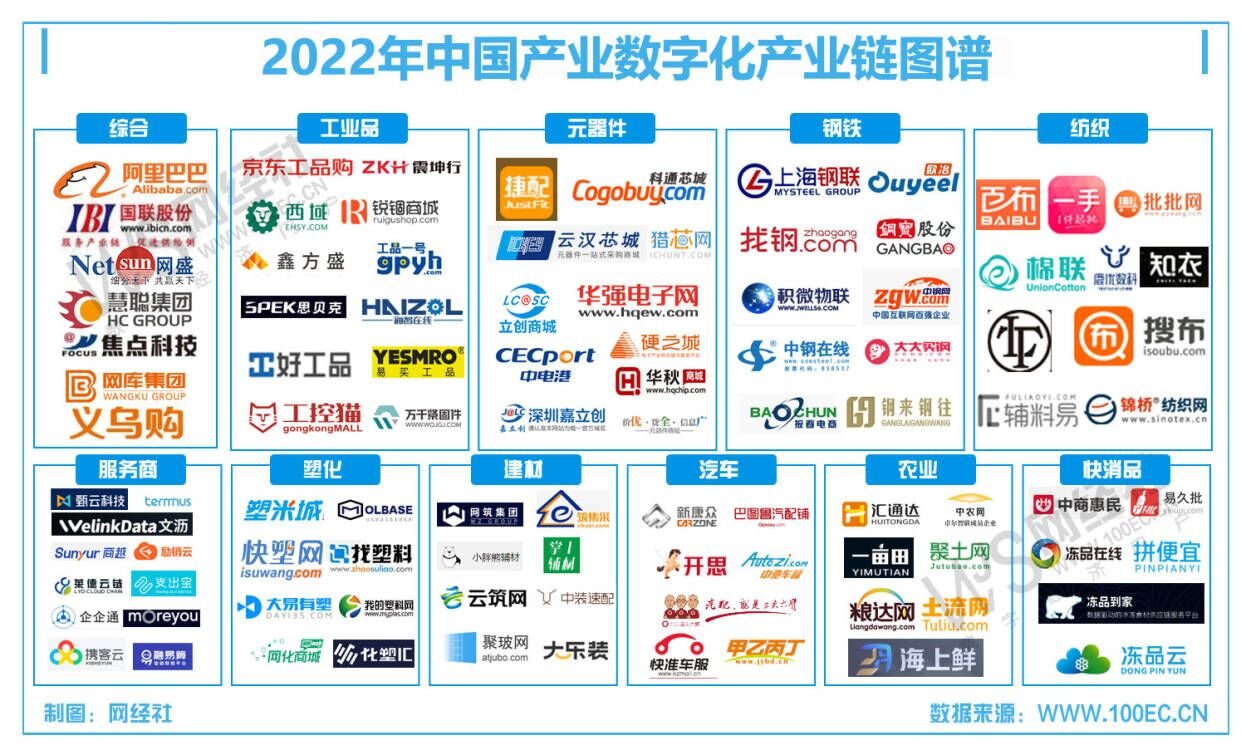 据网经社企业库(COP.100EC.CN)显示,当前,产业电商产业链中的玩家包括:综合类:阿里巴巴、国联股份、网盛生意宝、慧聪集团、焦点科技、网库集团、义乌购;垂直类:京东工业品、震坤行、西域、锐锢商城、鑫方盛、思贝克、捷配、科通芯城、云汉芯城、猎芯网、拍明芯城、上海钢联、欧冶云商、找钢网、百布、一手、搜布、塑米城、摩贝、找塑料、网筑集团、筑集采、小胖熊、康众汽配、巴图鲁、开思、中驰车福、汇通达、中农网、海上鲜、中商惠民、易久批、冻品在线等;服务商类:甄云科技、端点、文沥、商越、励销云、莱德云链、支出宝、企企通等。