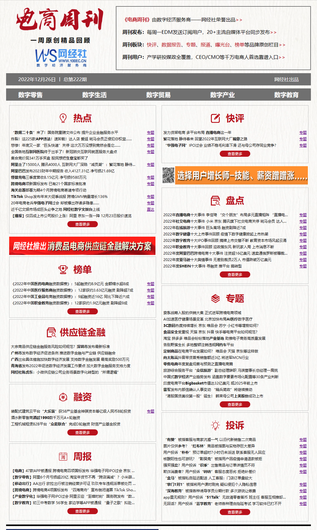 十二月第三周(12月17日-12月23日),各电商领域又有哪些事?淘宝天猫2023年货节不再“跨店满减”,跨境电商4项新国标发布,亿咖通科技登陆纳斯达克,金山云拟于港交所上市。以下为网经社为您带来本周数字零售、数字生活、跨境电商及产业数字化各电商平台最新动态回顾。