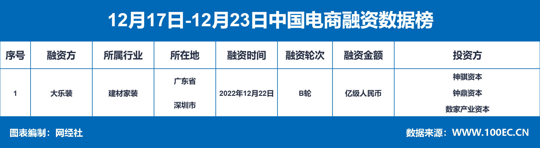 据网经社“电数宝”电商大数据库(DATA.100EC.CN)监测显示,截至目前,十二月第三周各电商领域的投融资事件为1起,总融资额约为1亿元(币种:人民币),涉及的平台为:大乐装。