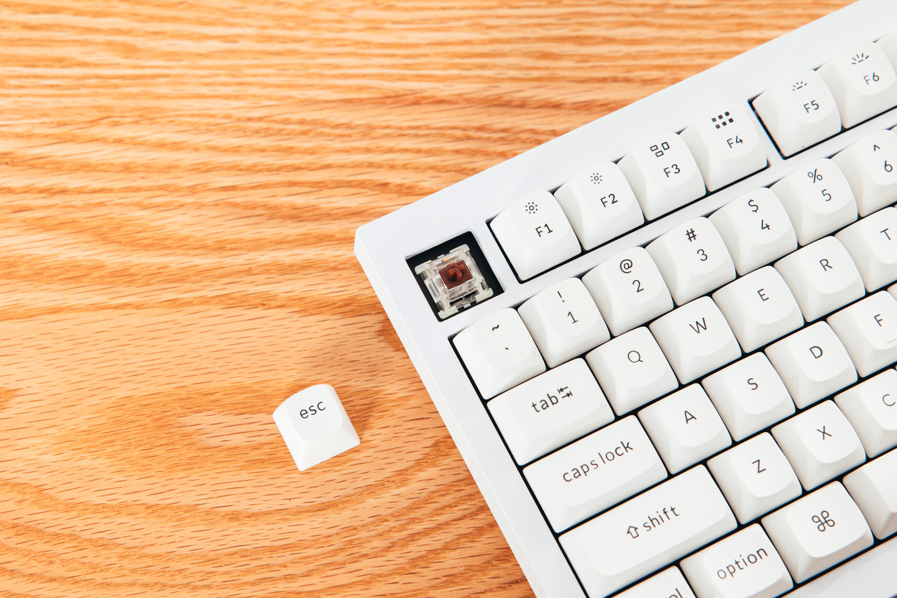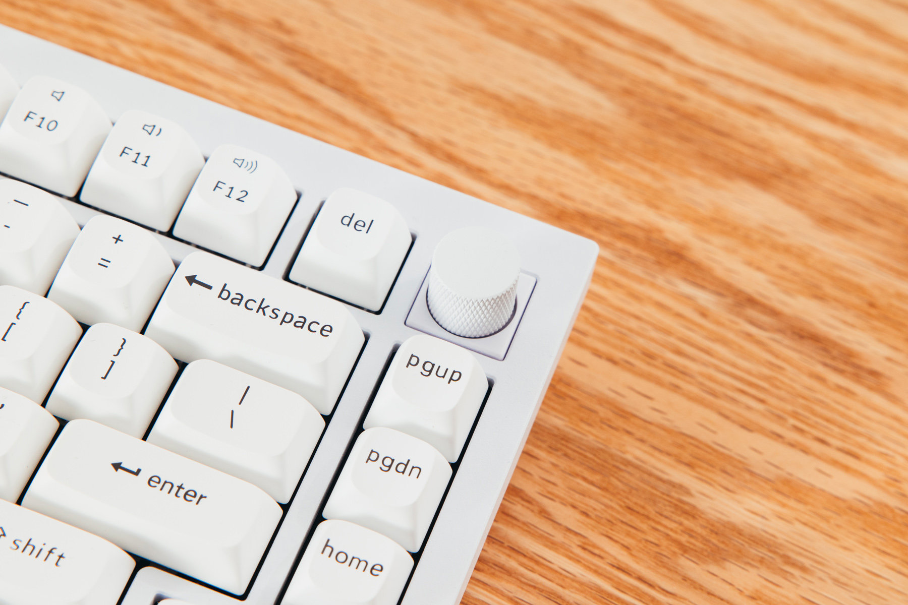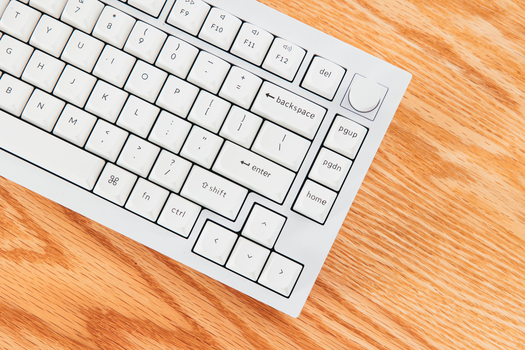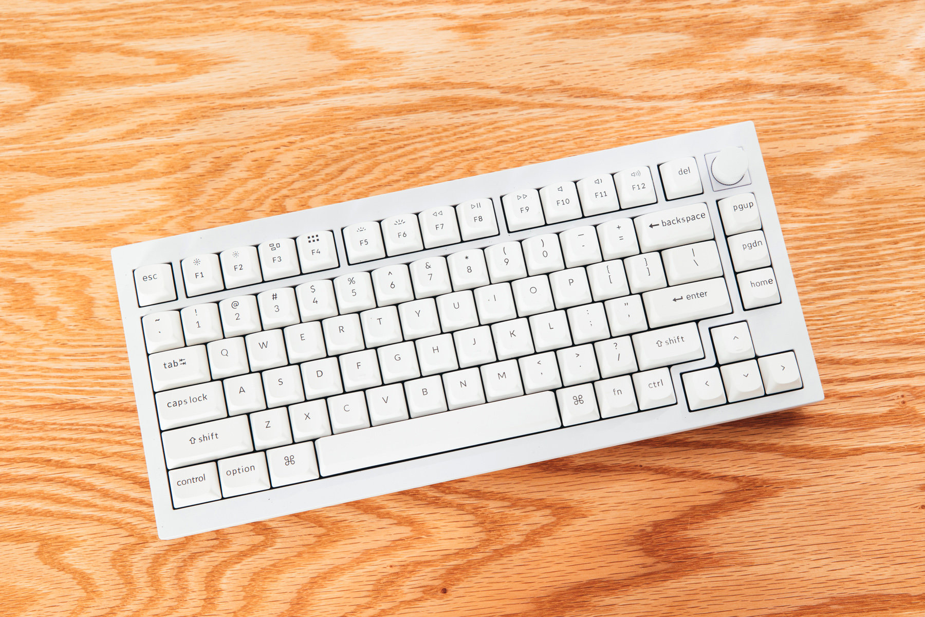 Keychron Q1 采用的 75% 配列,按键数量 81 颗,非紧凑布局,右上角的圆形旋钮可以实现调节音量和静音功能,旋钮表面还提供了棱形防滑槽,质感到位。