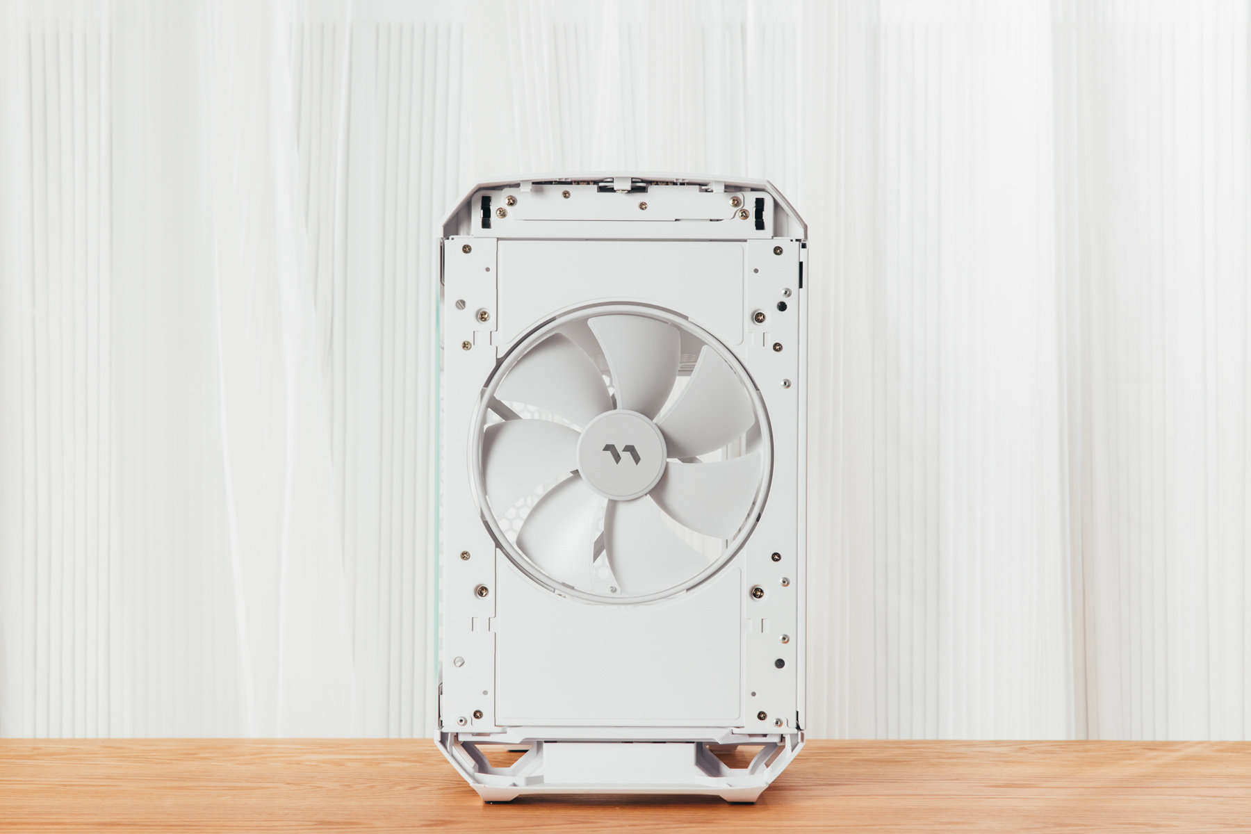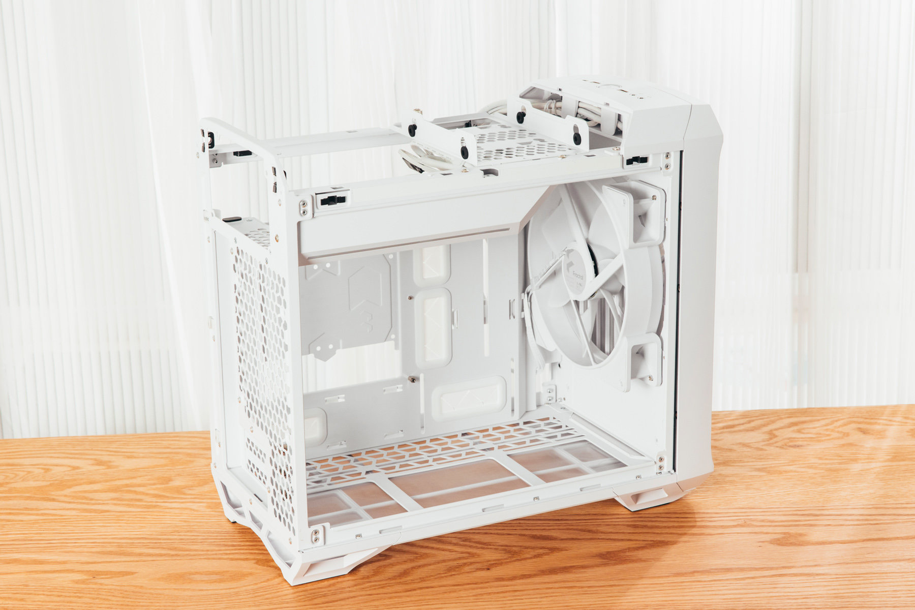 侧后方一览,其实和经典的Torrent设计思路一样,同样的顶置电源仓、同样的架高脚垫设计,不一样的是规格尺寸,Torrent Nano RGB前面板只能支持一把18cm风扇或者2把12cm风扇,通过更换配件可以在单18cm/双12cm/240水冷间切换。
