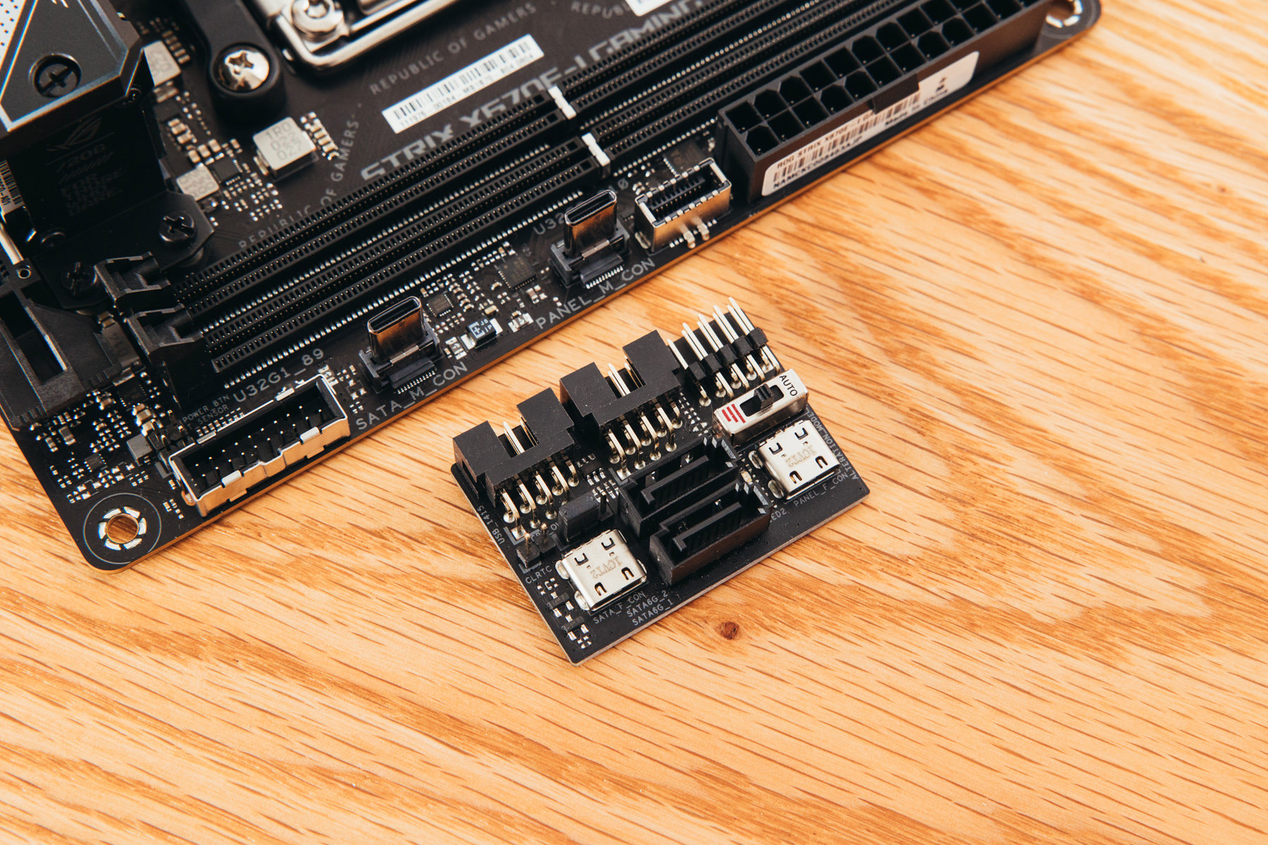 FPS-II扩展卡,使用两个USB-C和主板直接连接,FPS-II扩展卡主要集成了双SATA接口、前置面板跳针、双USB2.0接口、CPU超频跳线以及PCI-E切换开关,还具备短接清除CMOS的跳针,扩展卡和Z690i以及790i设计完全一致,只是不知道能不能通用。