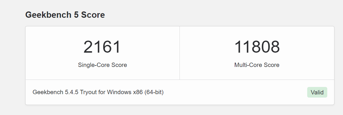 Geekbench 5 Score测试中,单核2161,多核跑分11808。
