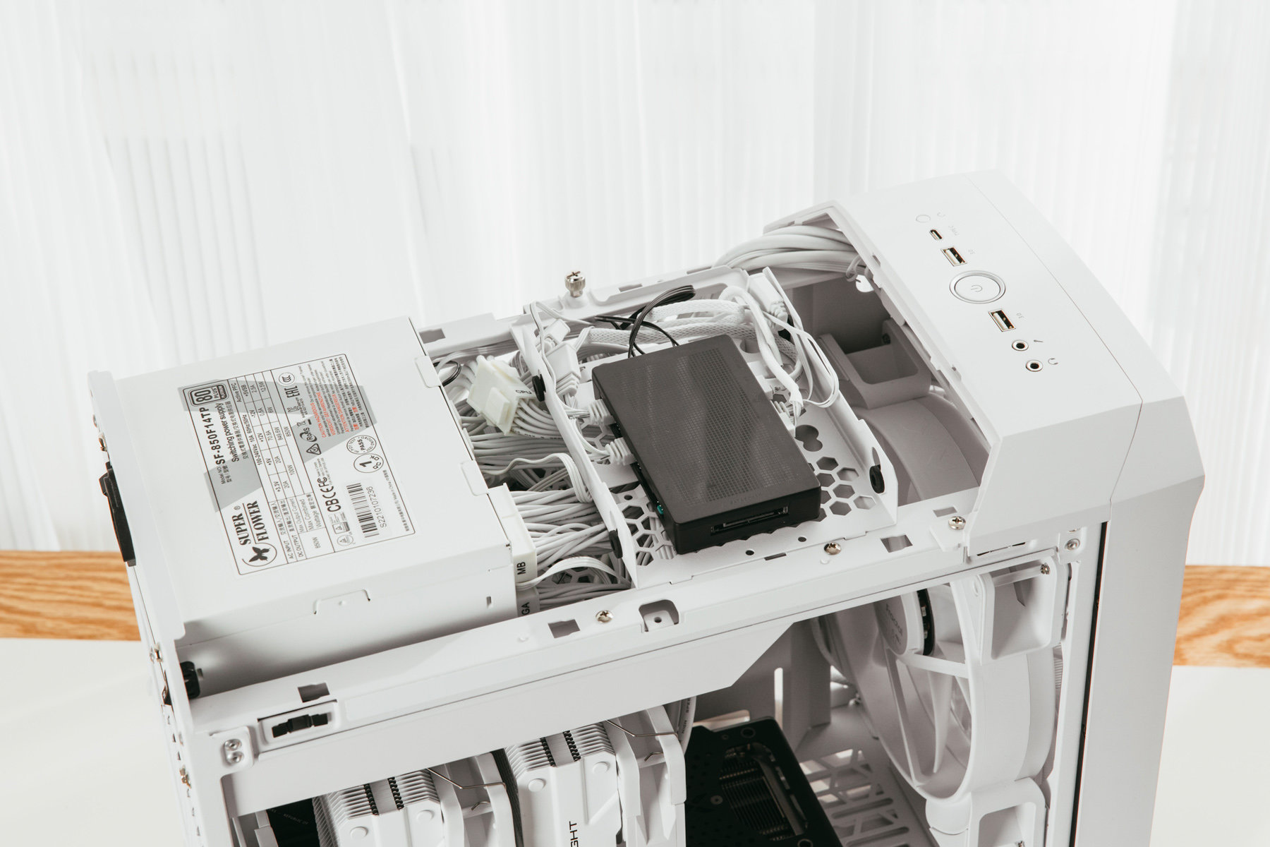 拆卸顶板,换个角度应该更能看清楚结构,电源上置,还提供了一块3.5寸机械硬盘安装空间,自带的IO线材也全为白色,这点就非常值得称赞。