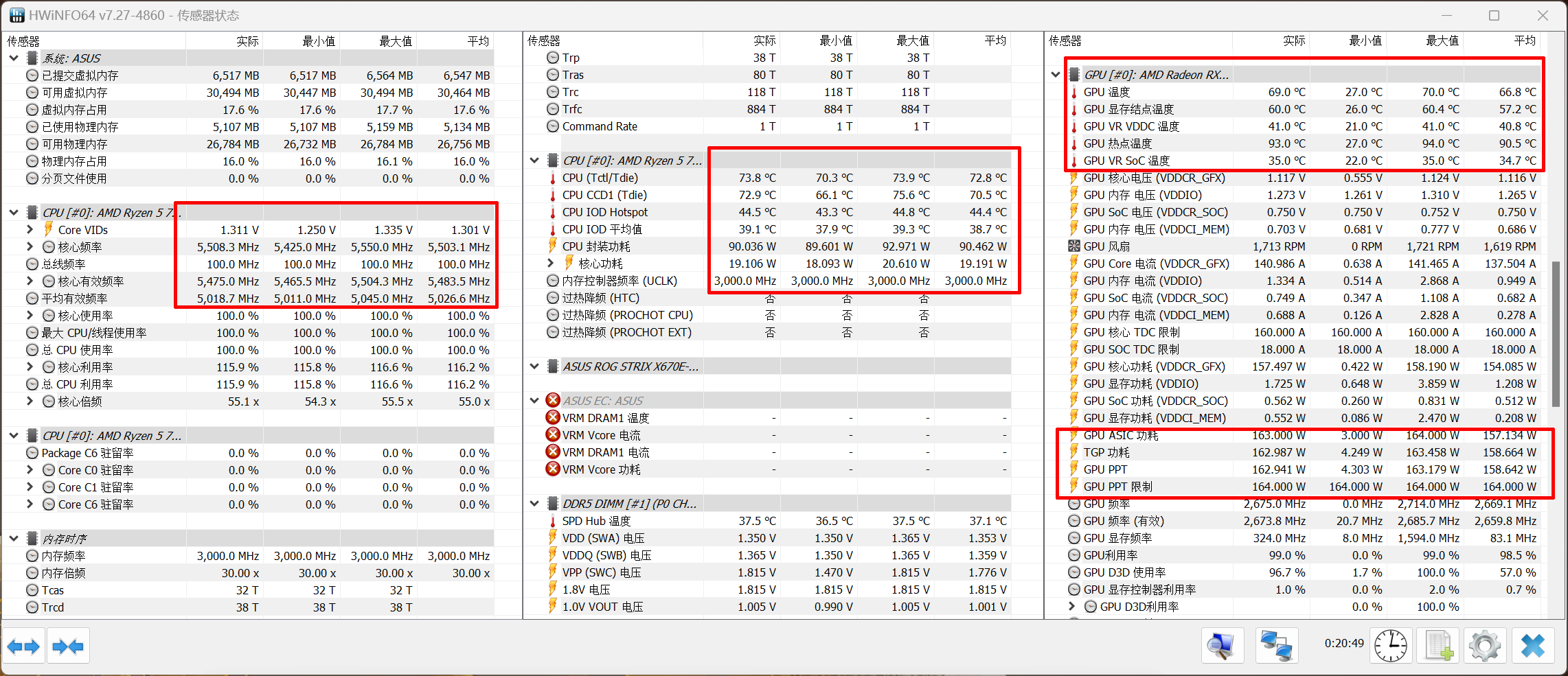 拷机测试230分钟,处理器平均温度73度,CPU封装功耗平均91W,峰值95W,此时处理器平均主频5.48Ghz,峰值主频5.5Ghz。