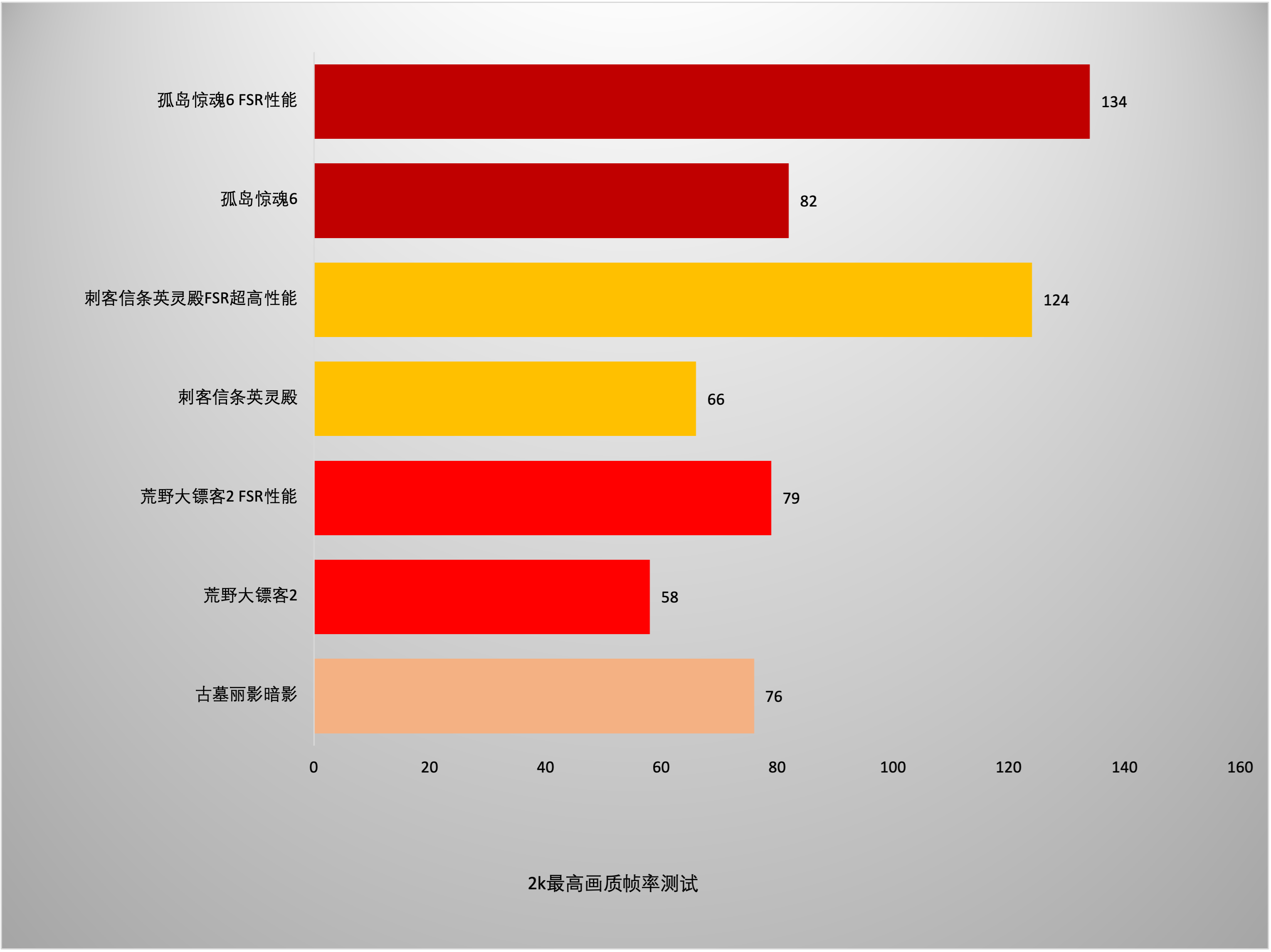 2K最高画质下讯景(XFX) RX 6650XT 8GB 海外版表现也还不错,帧率最低也接近60帧,这次孤岛惊魂6和刺客信条英灵殿开启FSR后表现都不错,提升幅度巨大。