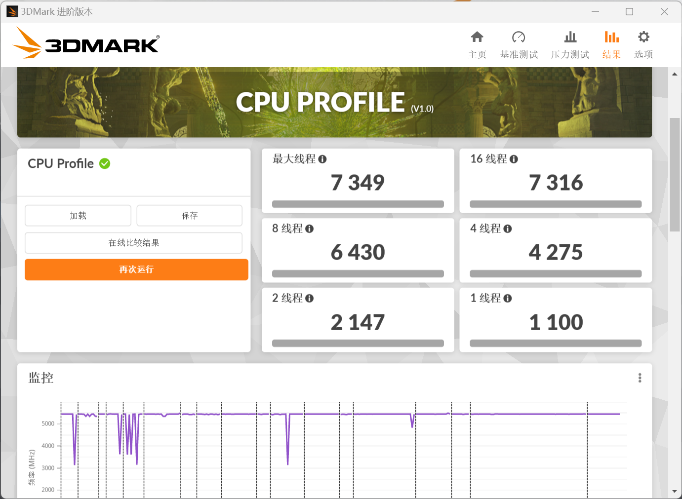 CPU Profile测试中,锐龙9 7600X最大线程分数7349,1线程得分1110。
