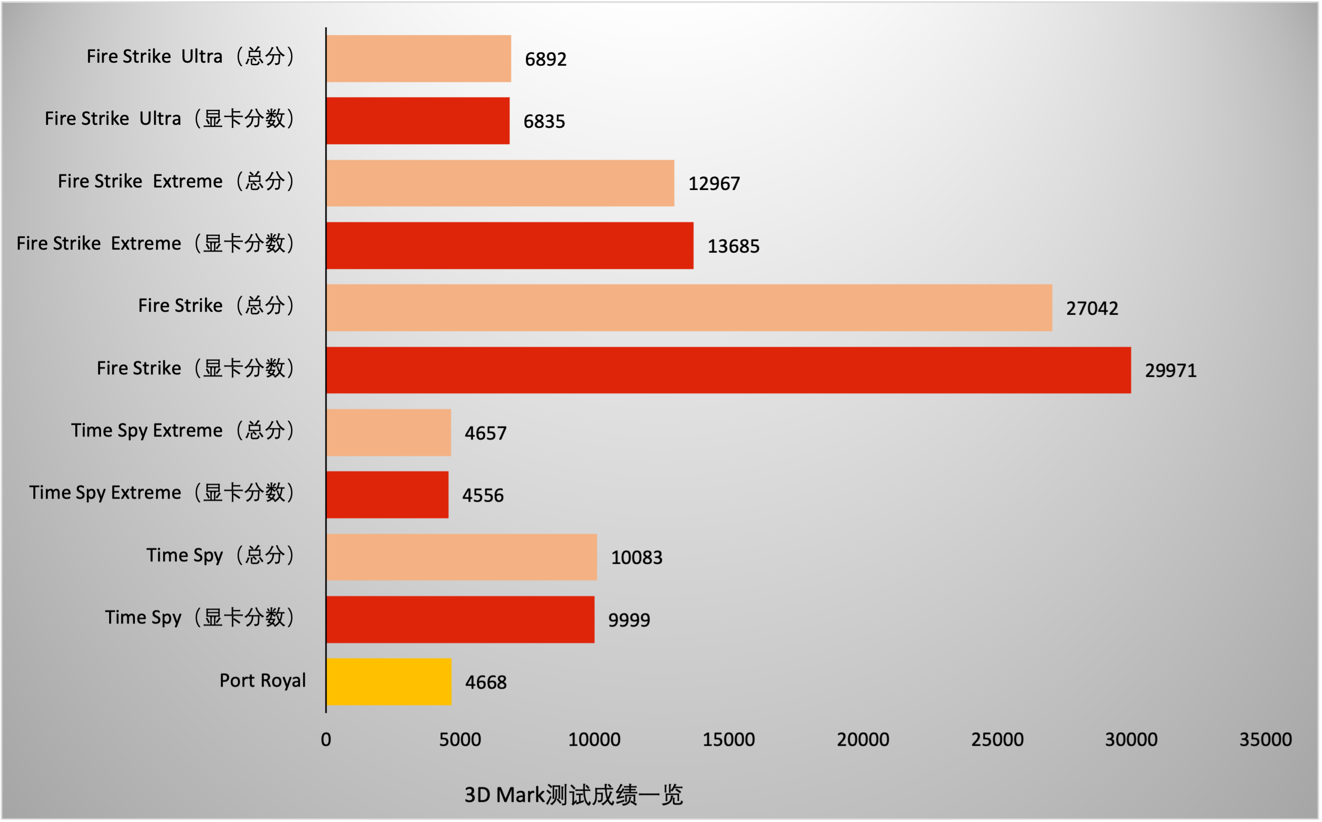 Time Spy Extreme得分4657,Time Spy得分10083,Fire Strike 27042,Fire Strike Extreme 12967,Fire Strike Ultra 6892;针对光追测试的Port Royal得分4668。
