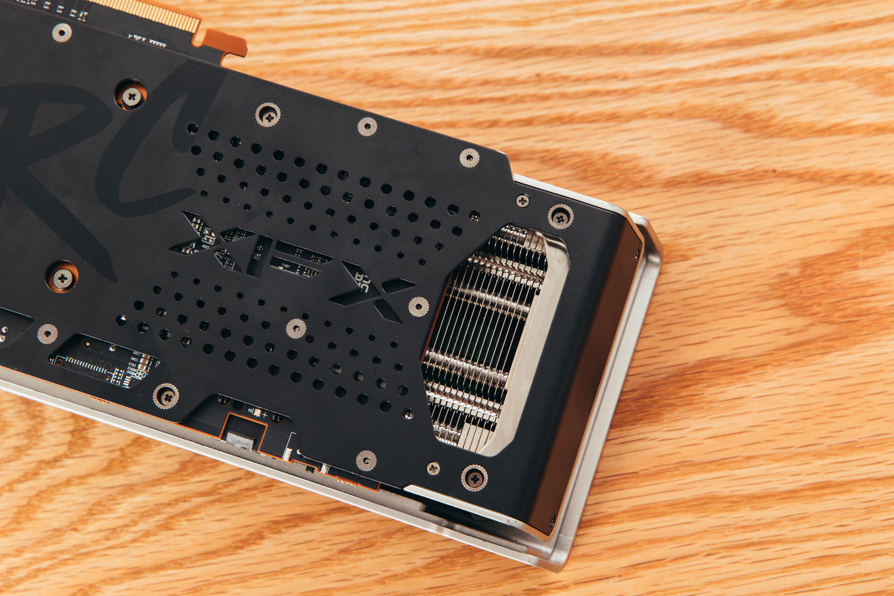 显卡背面设计了大面积镂空协助散热,背板则是一体化的金属材质。